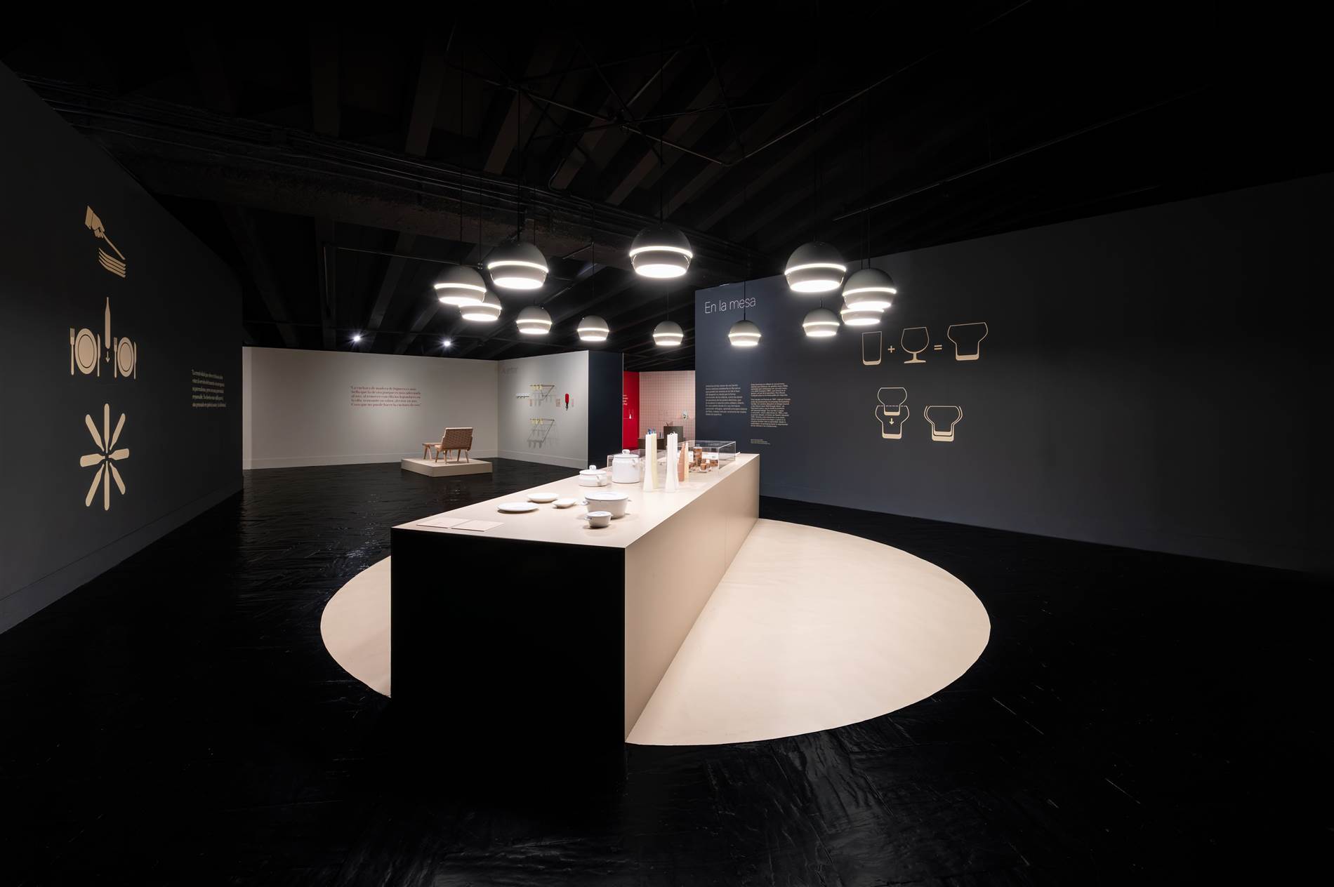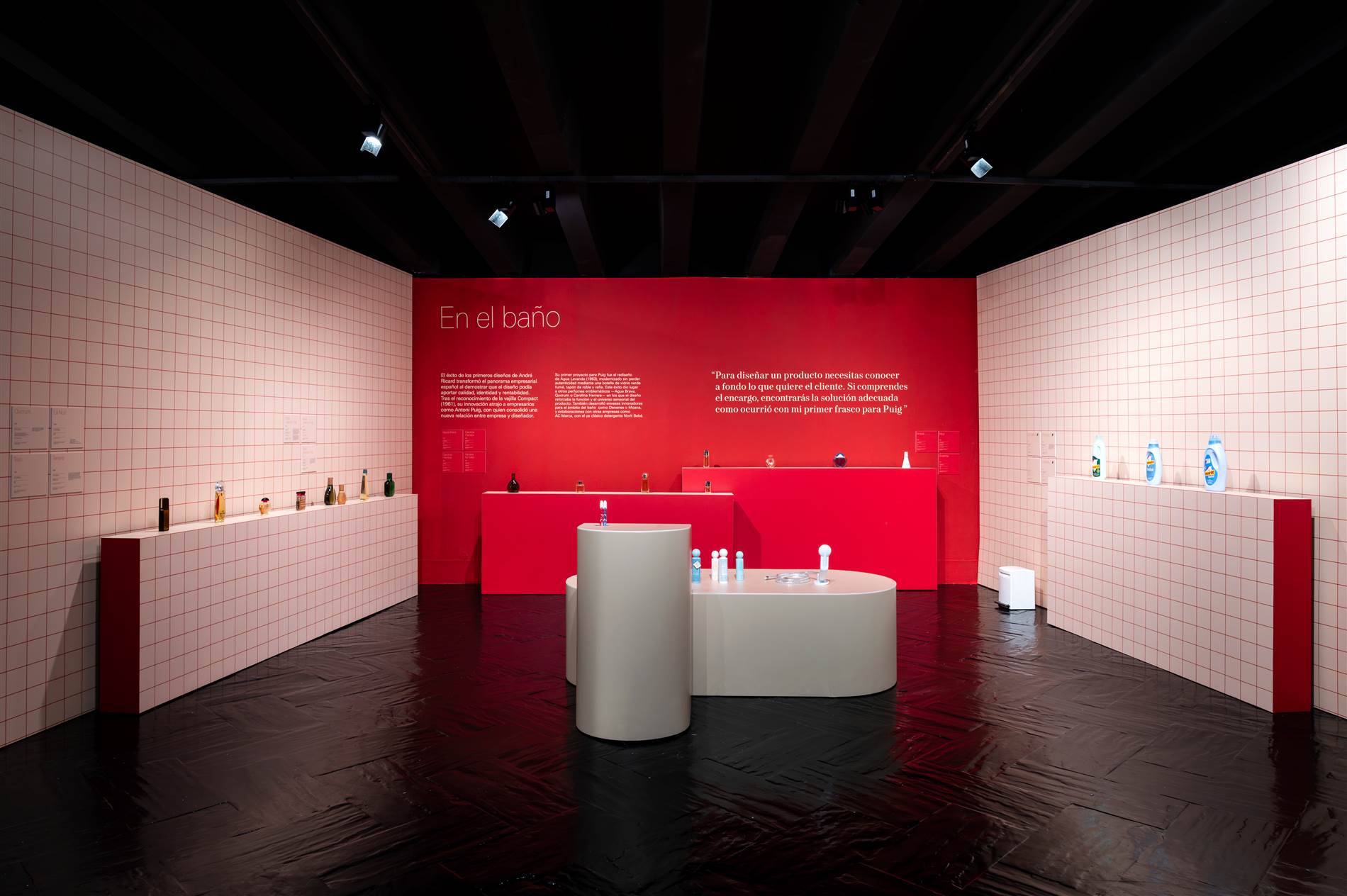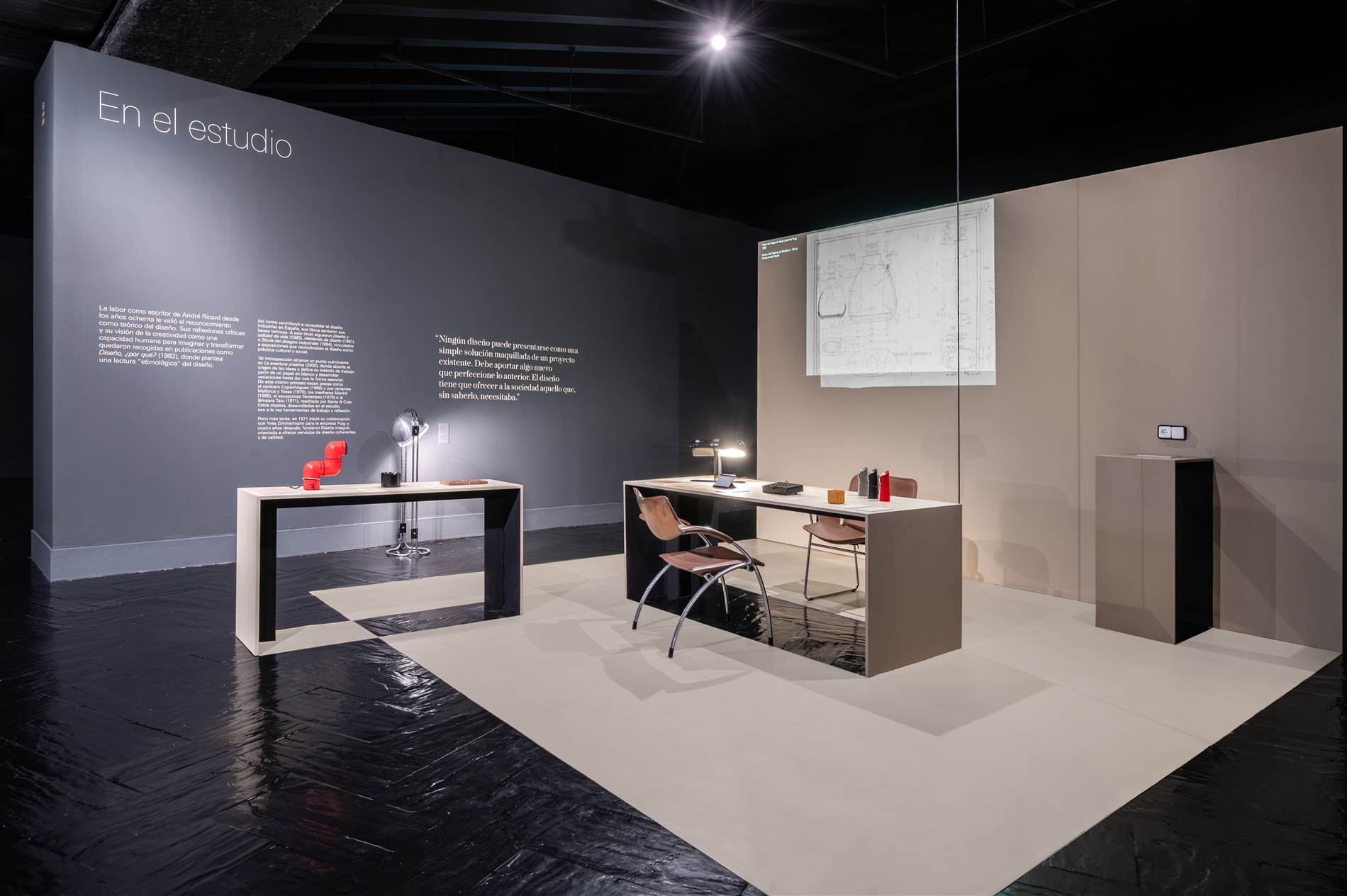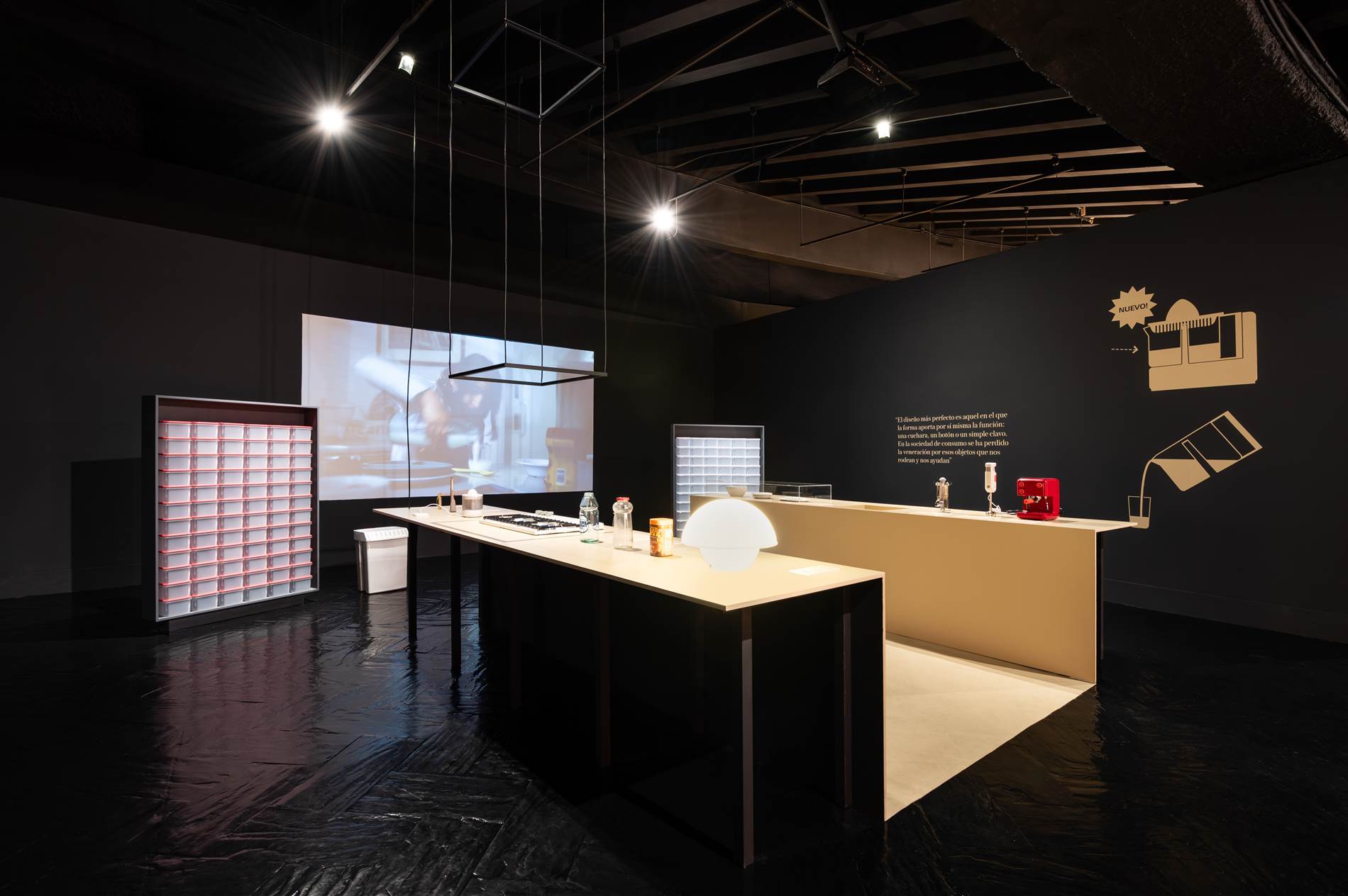 “La primera decisión fue hacer desaparecer visualmente el immenso contenedor —paredes, techo y suelo de la sala— y potenciar el tratamiento oscuro general de la sala. Por contra, los diferentes ámbitos de la exposición, propuestos como islas, se han tratado en beis, el color que convive con las piezas. Son un conjunto de planos que se pliegan o se recortan para generar volumetrías simples que generan contexto a los objetos sin quitarles protagonismo —la encimera de una cocina, un escritorio, la repisa de un baño, etc. Menos cuando las colecciones de procedencia lo han exigido, las piezas se presentan siempre liberadas de vitrinas, y esto posibilita que la relación del visitante con la exposición sea natural, fluida, desde la cotidianidad.”