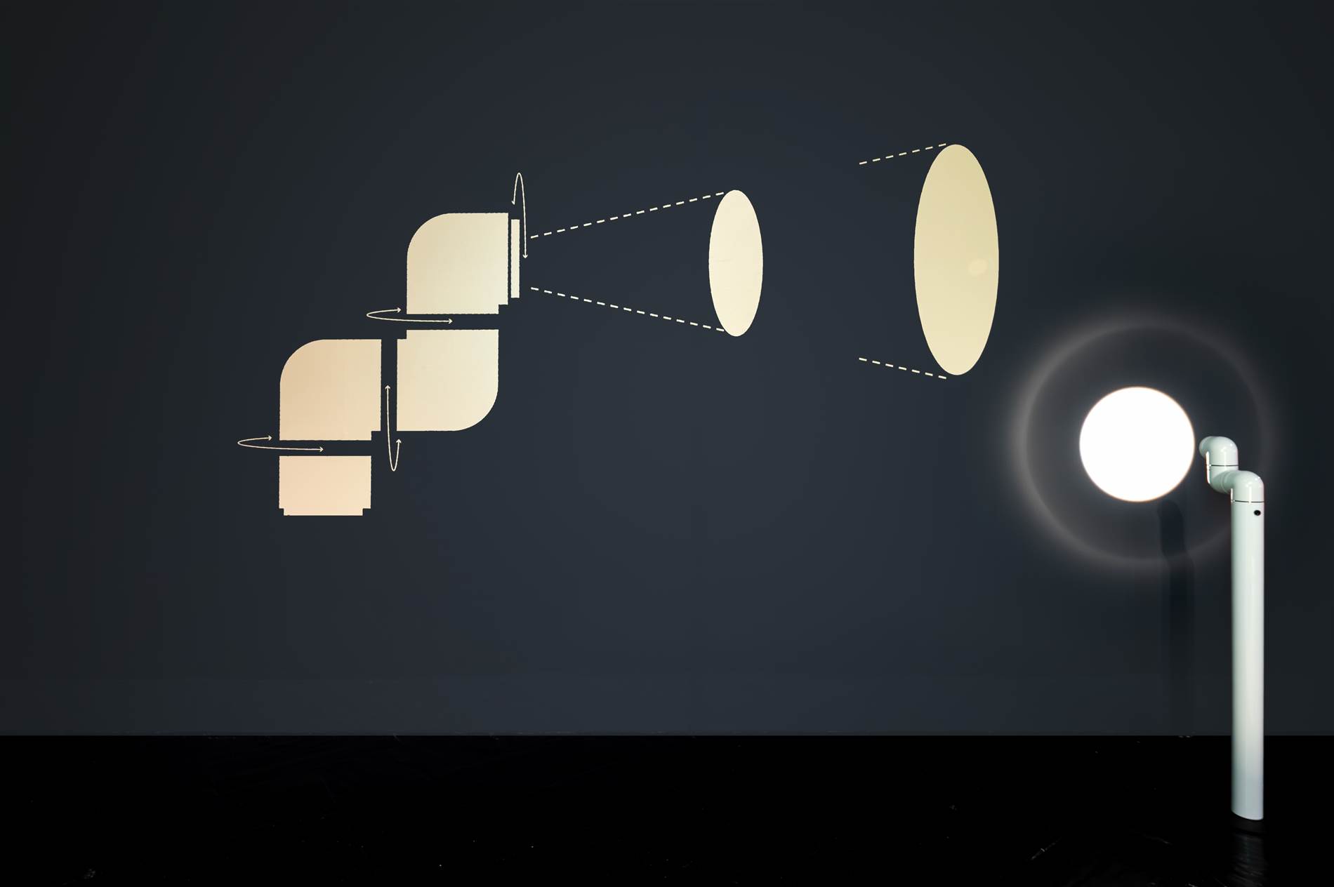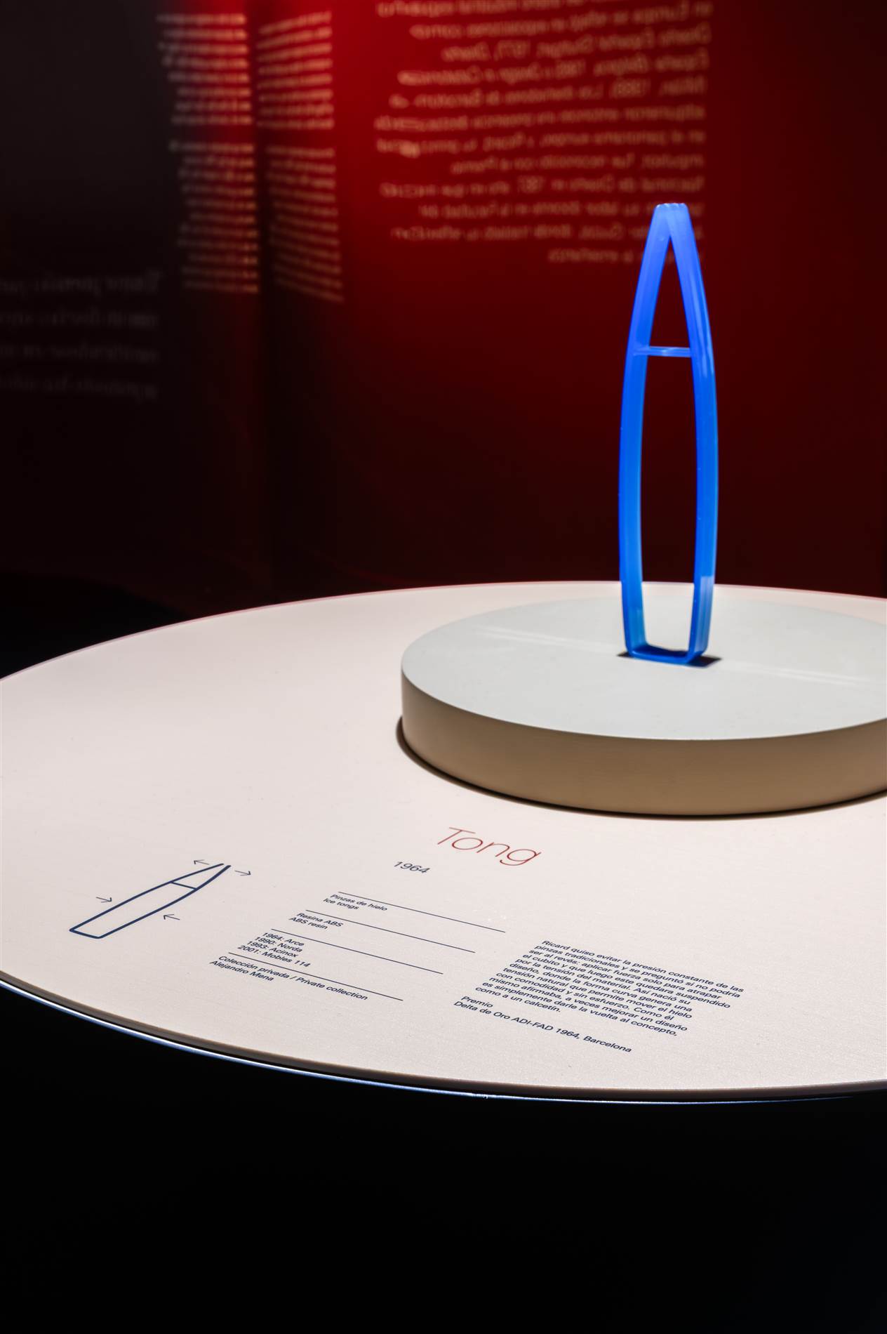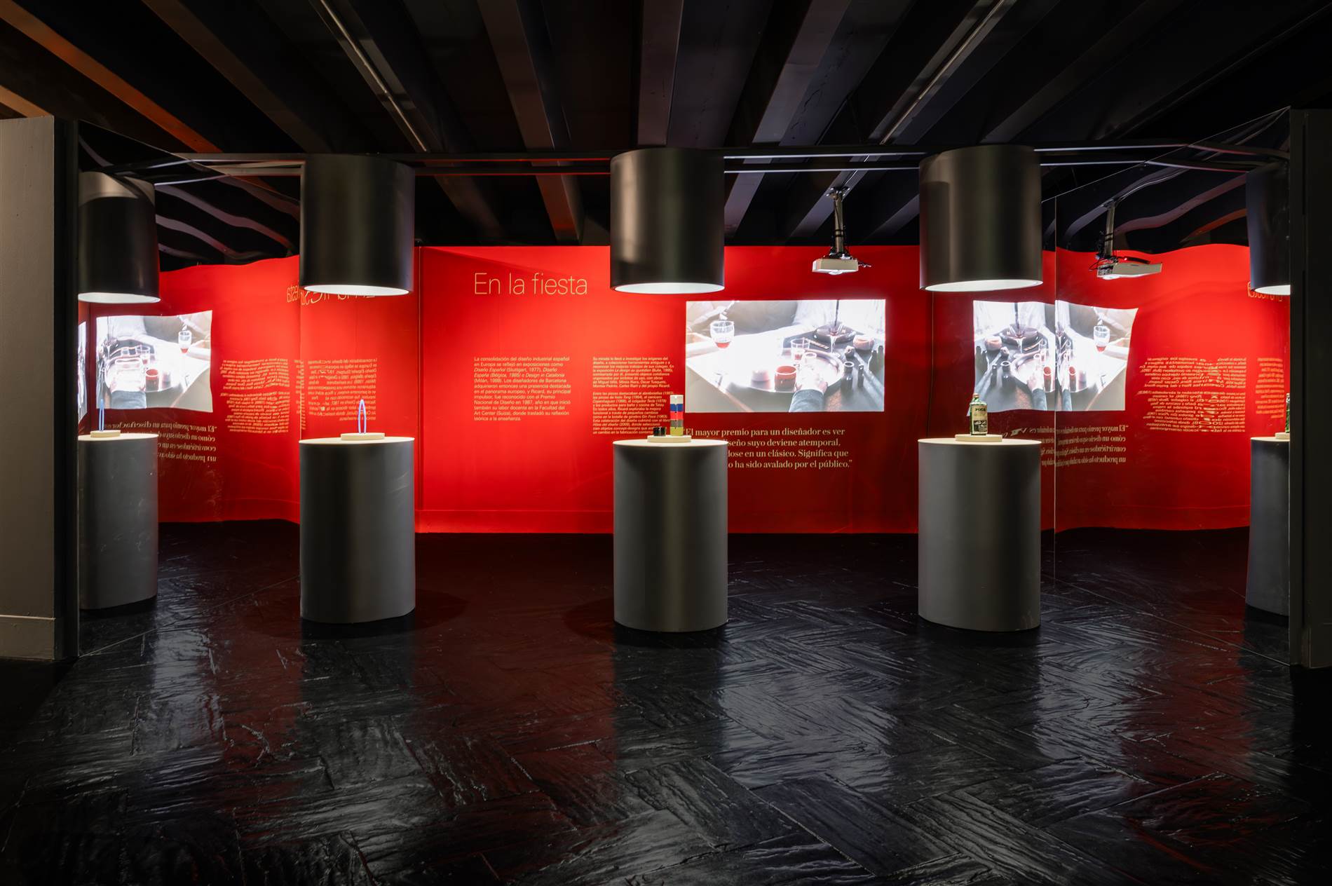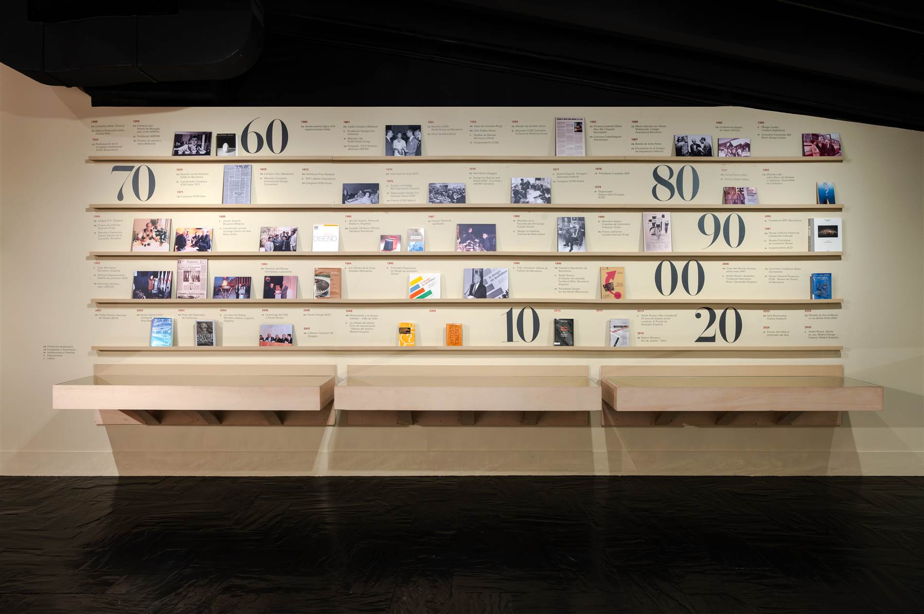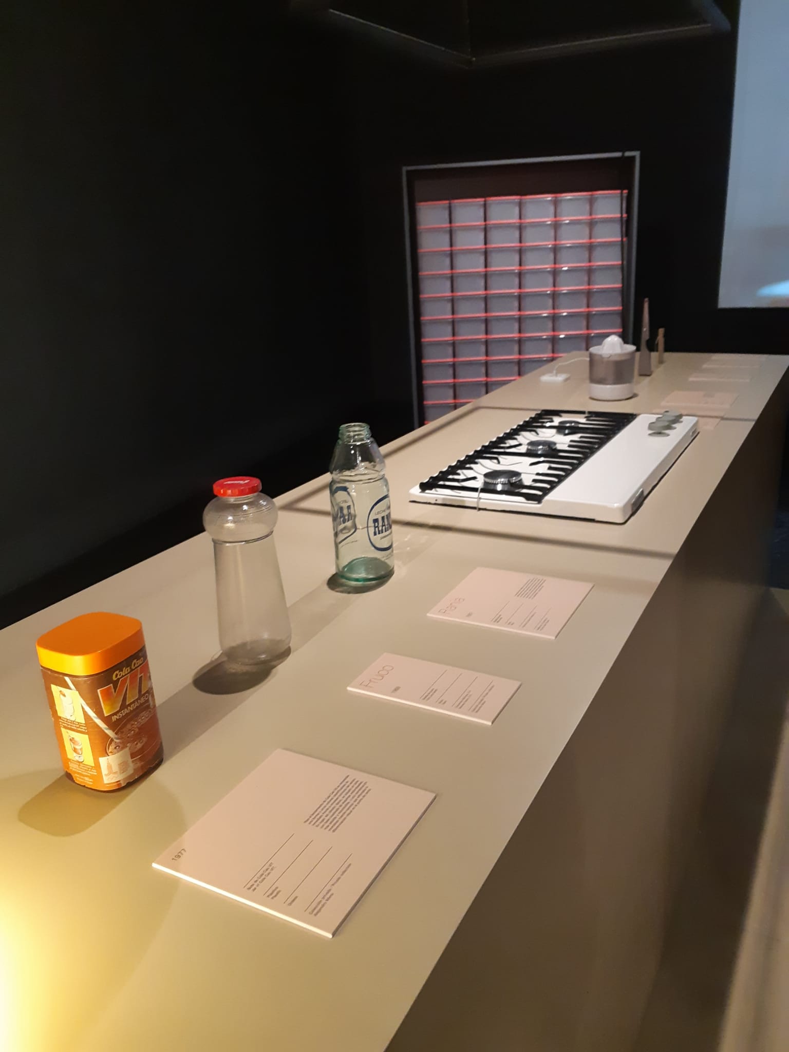 “La primera decisión fue hacer desaparecer visualmente el immenso contenedor —paredes, techo y suelo de la sala— y potenciar el tratamiento oscuro general de la sala. Por contra, los diferentes ámbitos de la exposición, propuestos como islas, se han tratado en beis, el color que convive con las piezas. Son un conjunto de planos que se pliegan o se recortan para generar volumetrías simples que generan contexto a los objetos sin quitarles protagonismo —la encimera de una cocina, un escritorio, la repisa de un baño, etc. Menos cuando las colecciones de procedencia lo han exigido, las piezas se presentan siempre liberadas de vitrinas, y esto posibilita que la relación del visitante con la exposición sea natural, fluida, desde la cotidianidad.”