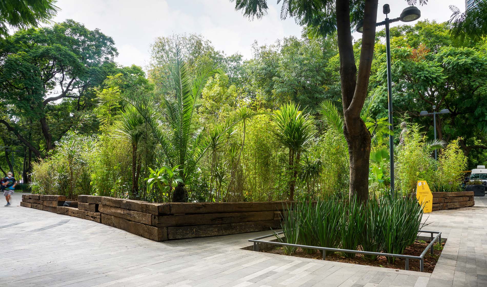 Oasis Sharjah, en Emiratos Árabes Unidos, (2013) donde el estudio OFFICE utilizó palmeras entre mallas metálicas para ubicarlas en el centro de la ciudad y construir un espacio donde reunirse y refrescarse.
