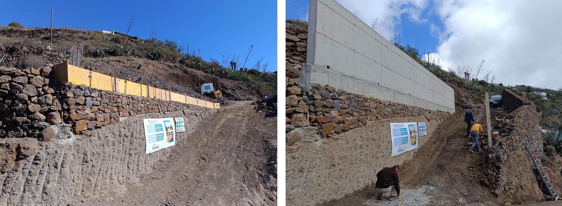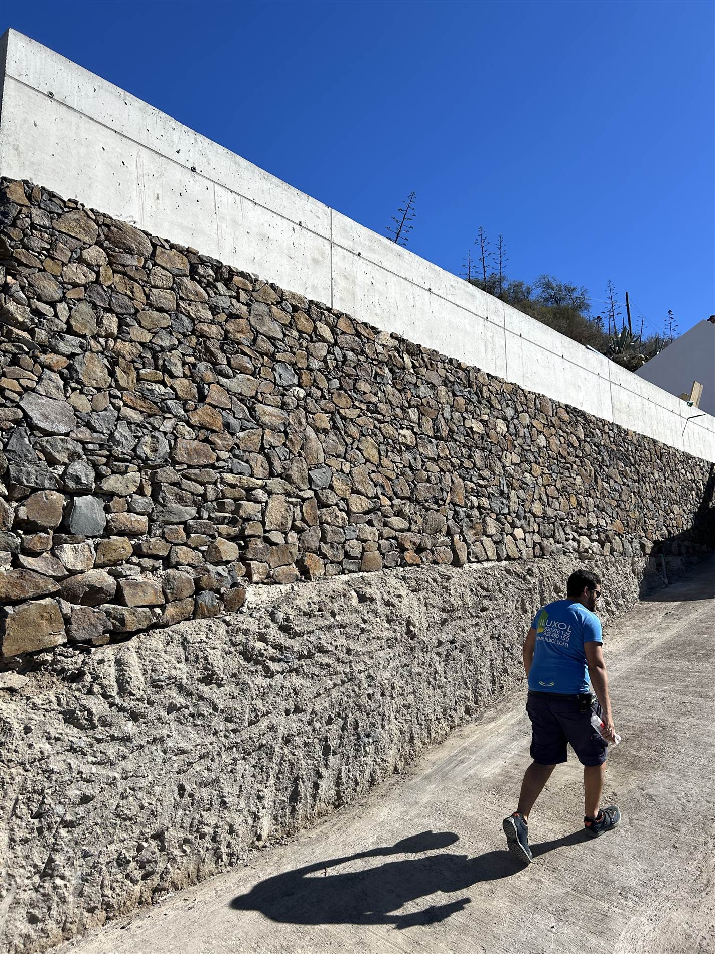 El muro de hormigón ejecutado sobre un un muro de piedra inicial se revistió con piedra de la excavación dejando únicamente los últimos 1,1 metros vistos