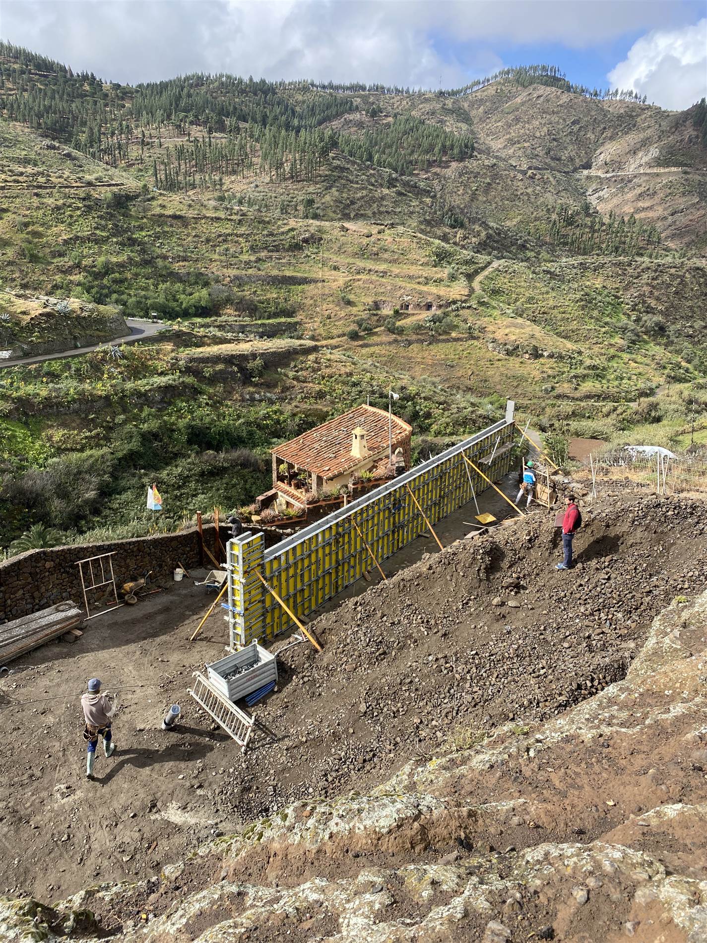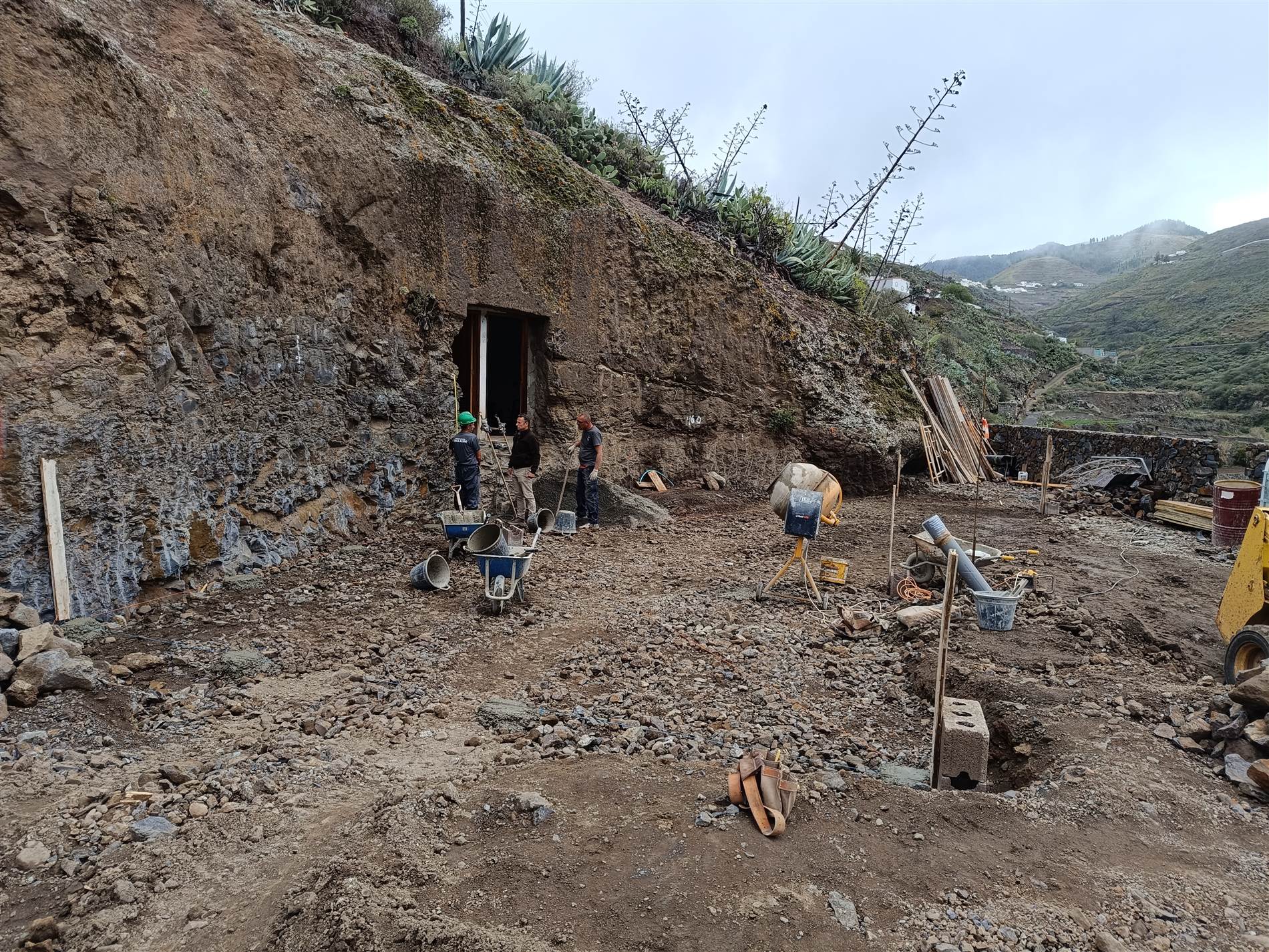 Terreno asegurado mediante el muro de contención, con la entrada abierta a la cueva.