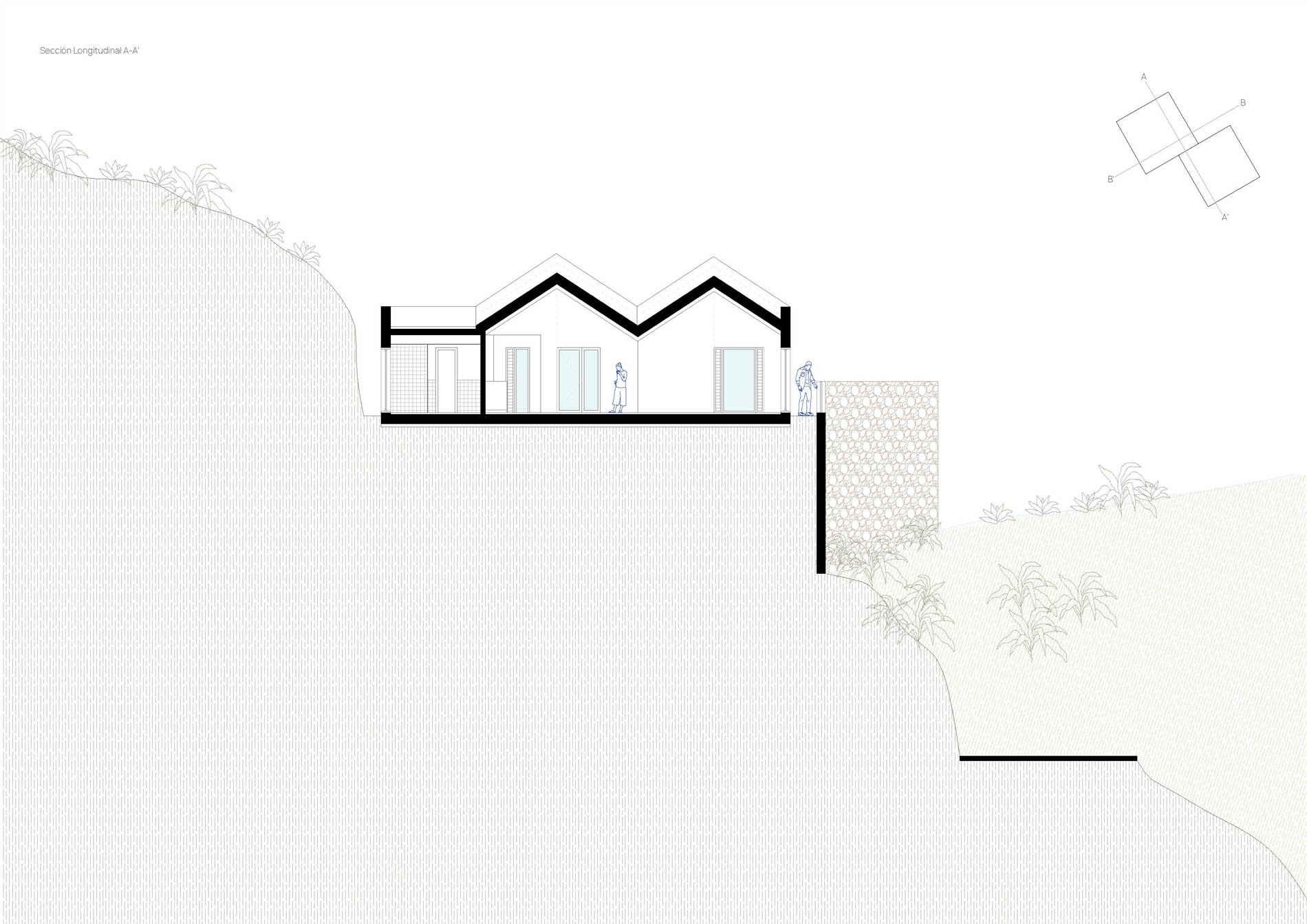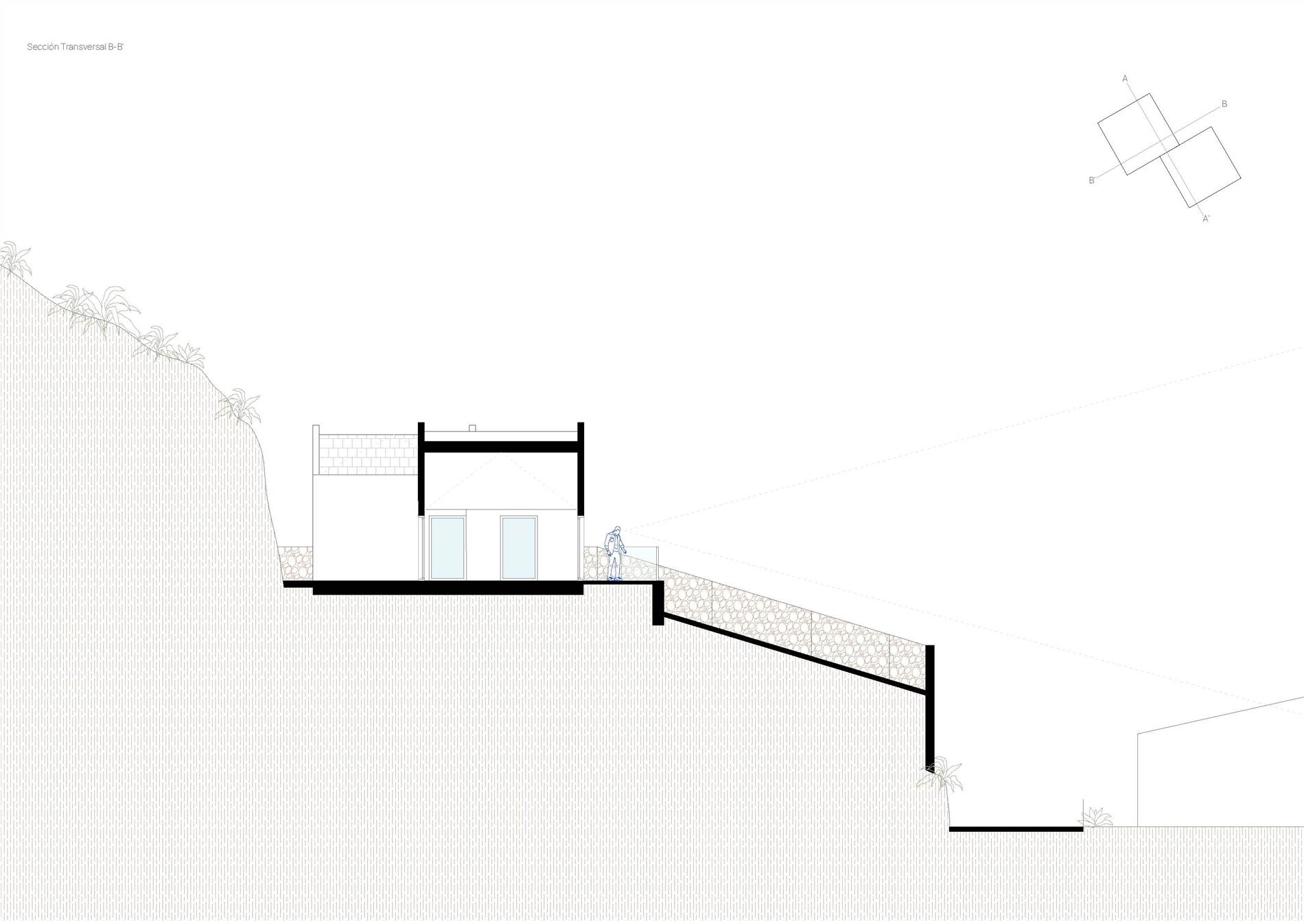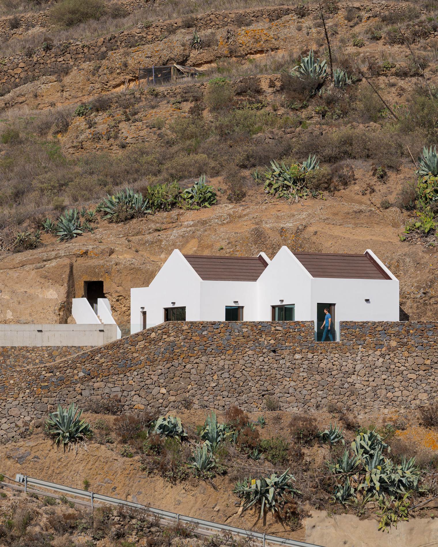 La vivienda se localiza en el singular entorno rural de Artenara, en una parcela de fuerte pendiente con vistas abiertas hacia barrancos y cumbres montañosas que configuran el paisaje característico del interior de Gran Canaria. La implantación responde a las condiciones topográficas y climáticas del lugar, aprovechando la orientación sur para garantizar un soleamiento continuo y utilizando un talud natural al norte como protección frente a los vientos dominantes. Estas circunstancias definen una estrategia de integración que busca una presencia respetuosa, capaz de fundirse con el territorio y reforzar la identidad local.