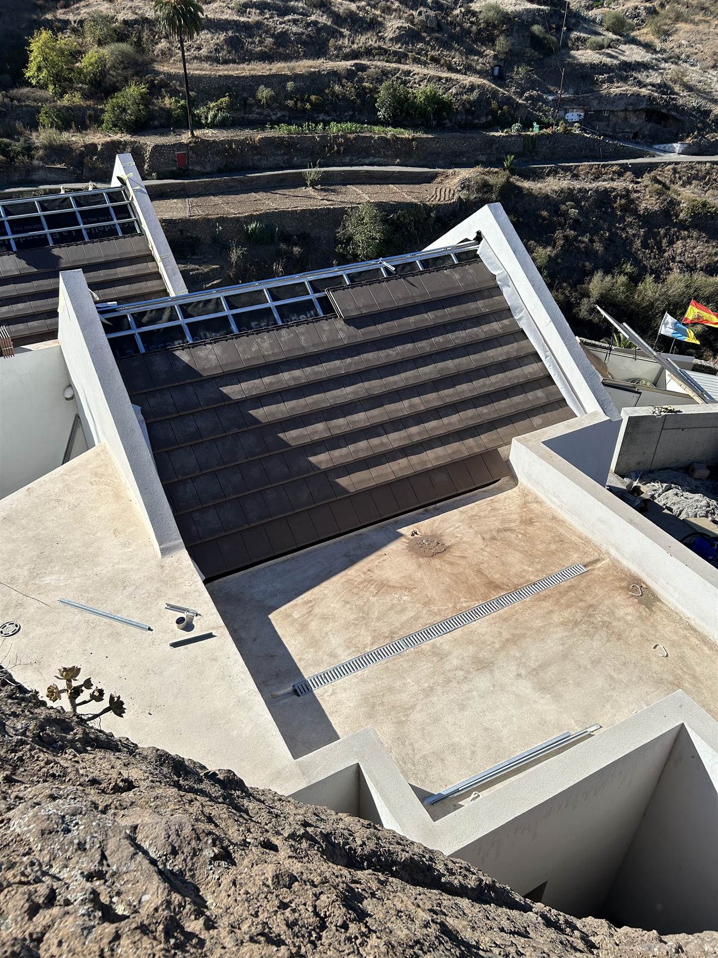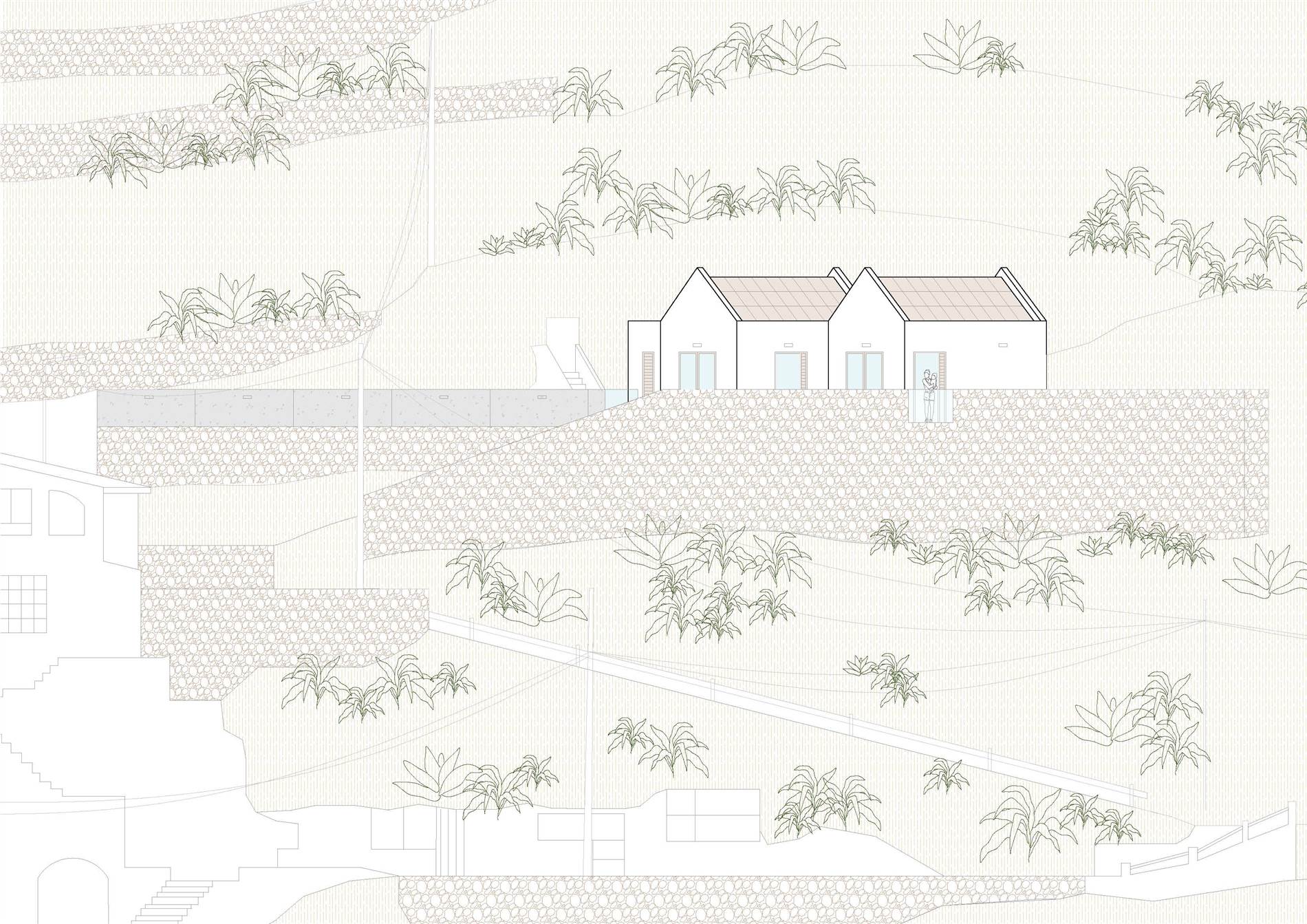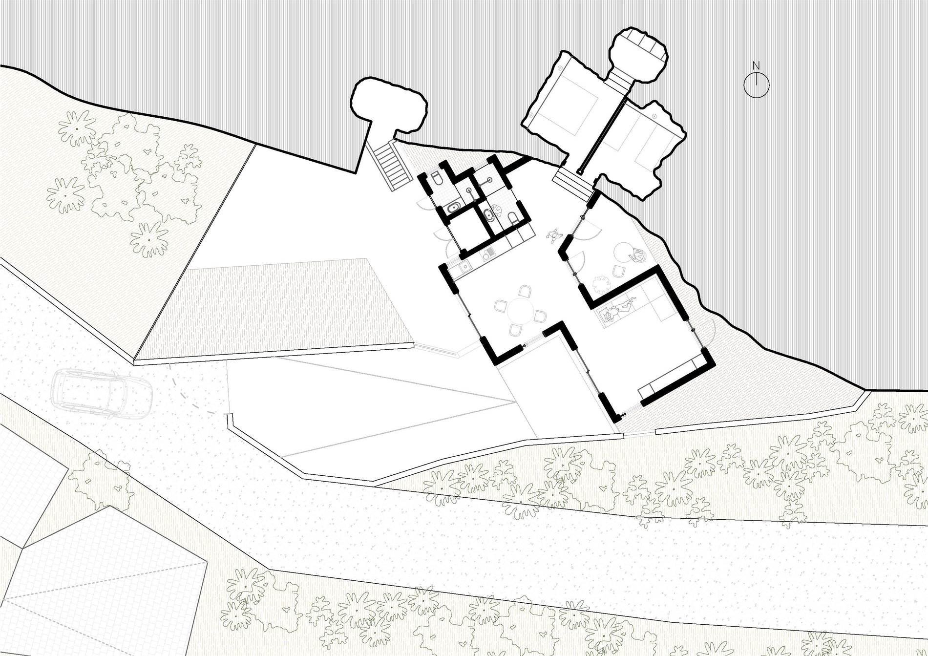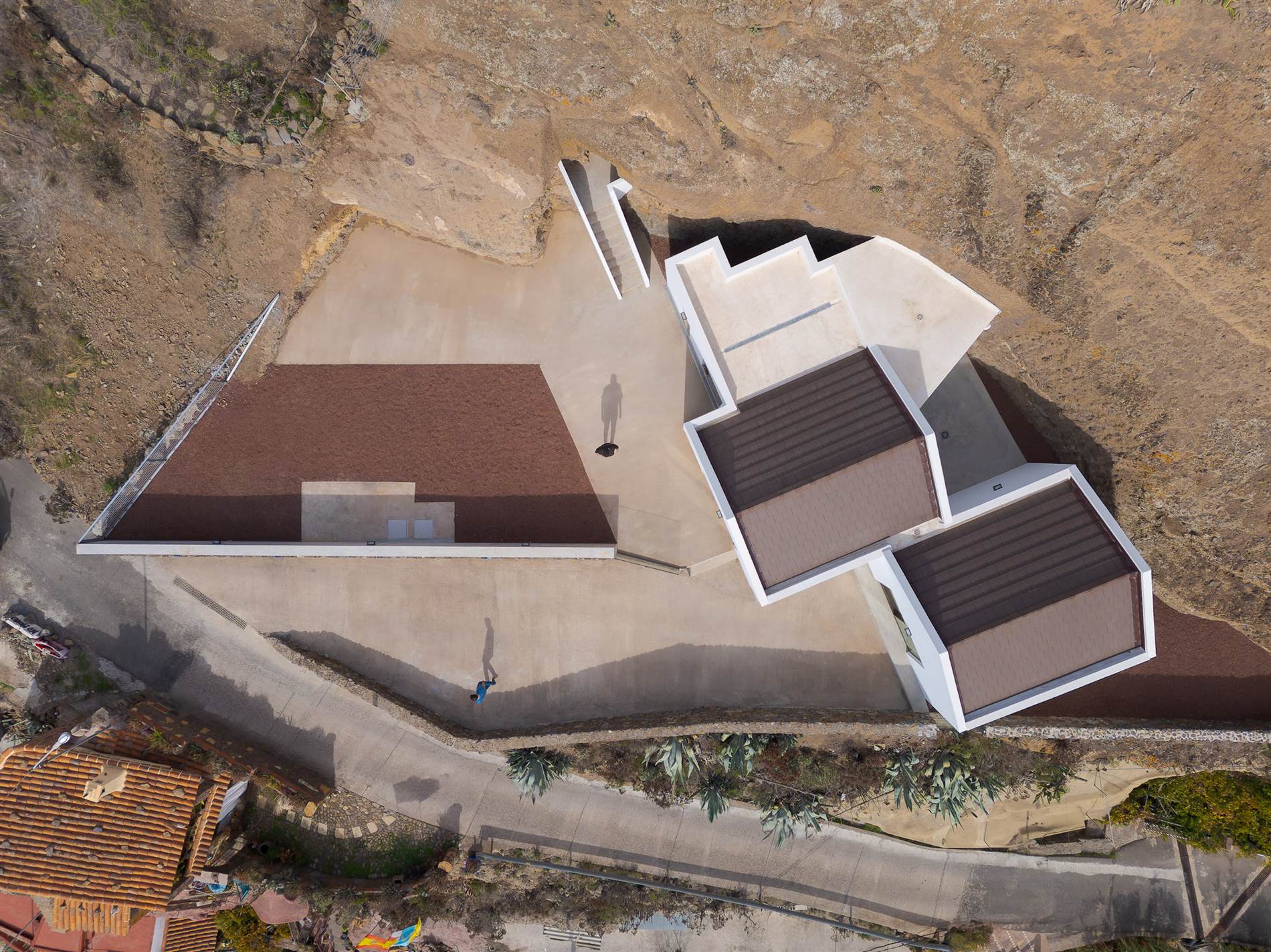 La vivienda se localiza en el singular entorno rural de Artenara, en una parcela de fuerte pendiente con vistas abiertas hacia barrancos y cumbres montañosas que configuran el paisaje característico del interior de Gran Canaria. La implantación responde a las condiciones topográficas y climáticas del lugar, aprovechando la orientación sur para garantizar un soleamiento continuo y utilizando un talud natural al norte como protección frente a los vientos dominantes. Estas circunstancias definen una estrategia de integración que busca una presencia respetuosa, capaz de fundirse con el territorio y reforzar la identidad local.