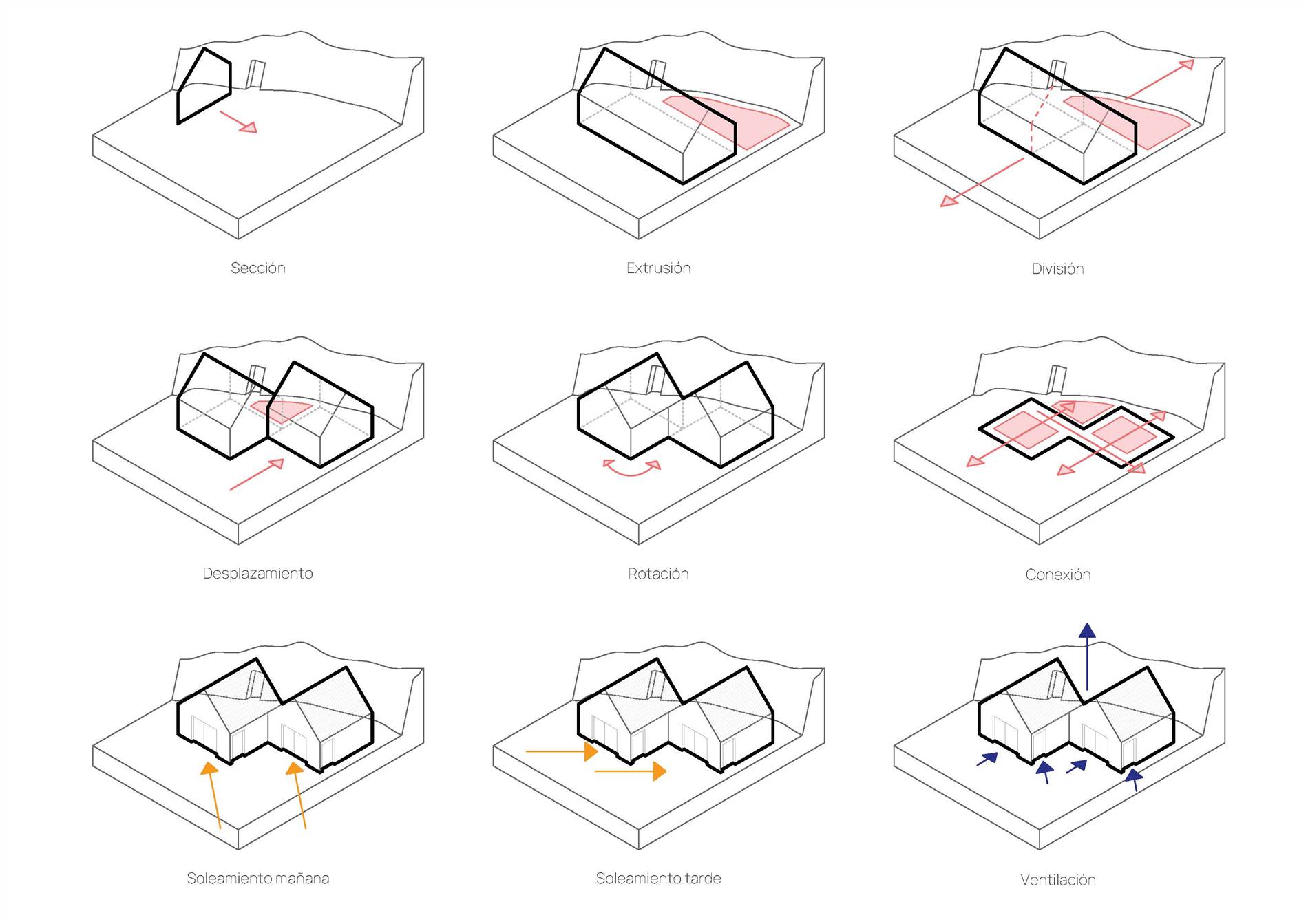 La propuesta reinterpreta la arquitectura vernácula canaria mediante volumetrías de cubierta a dos aguas y un patio interior que articula la organización espacial. Este patio actúa como núcleo funcional y climático: permite la ventilación cruzada natural, garantiza una iluminación abundante y ofrece un espacio estacional protegido que prolonga la vida doméstica hacia el exterior.