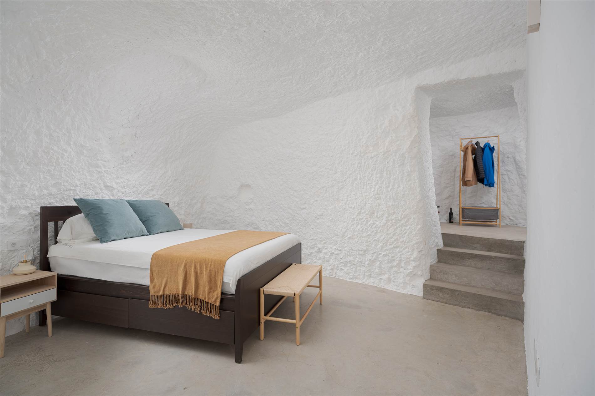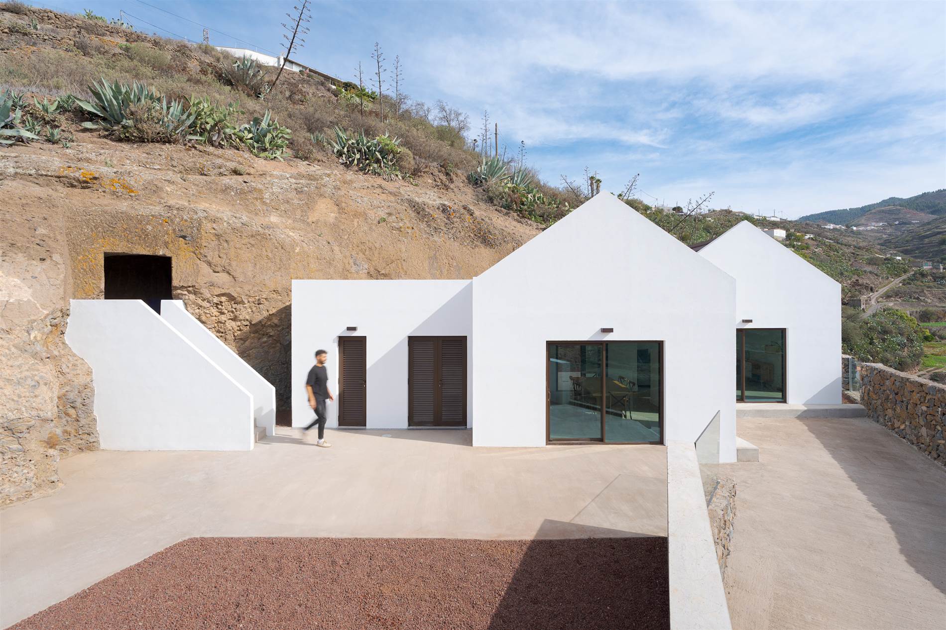 La conexión entre los espacios habitables y el paisaje circundante se materializa en visuales enmarcadas que dotan de singularidad a cada estancia, incluyendo la integración de la cueva preexistente como un ámbito habitable con condiciones de temperatura estables gracias a su inercia térmica.