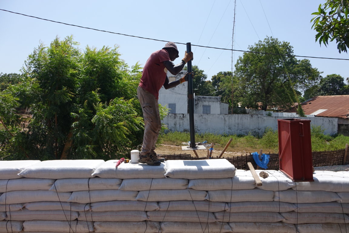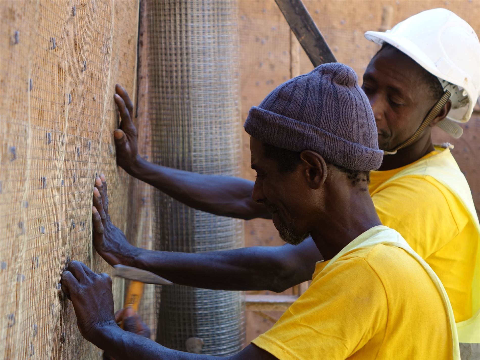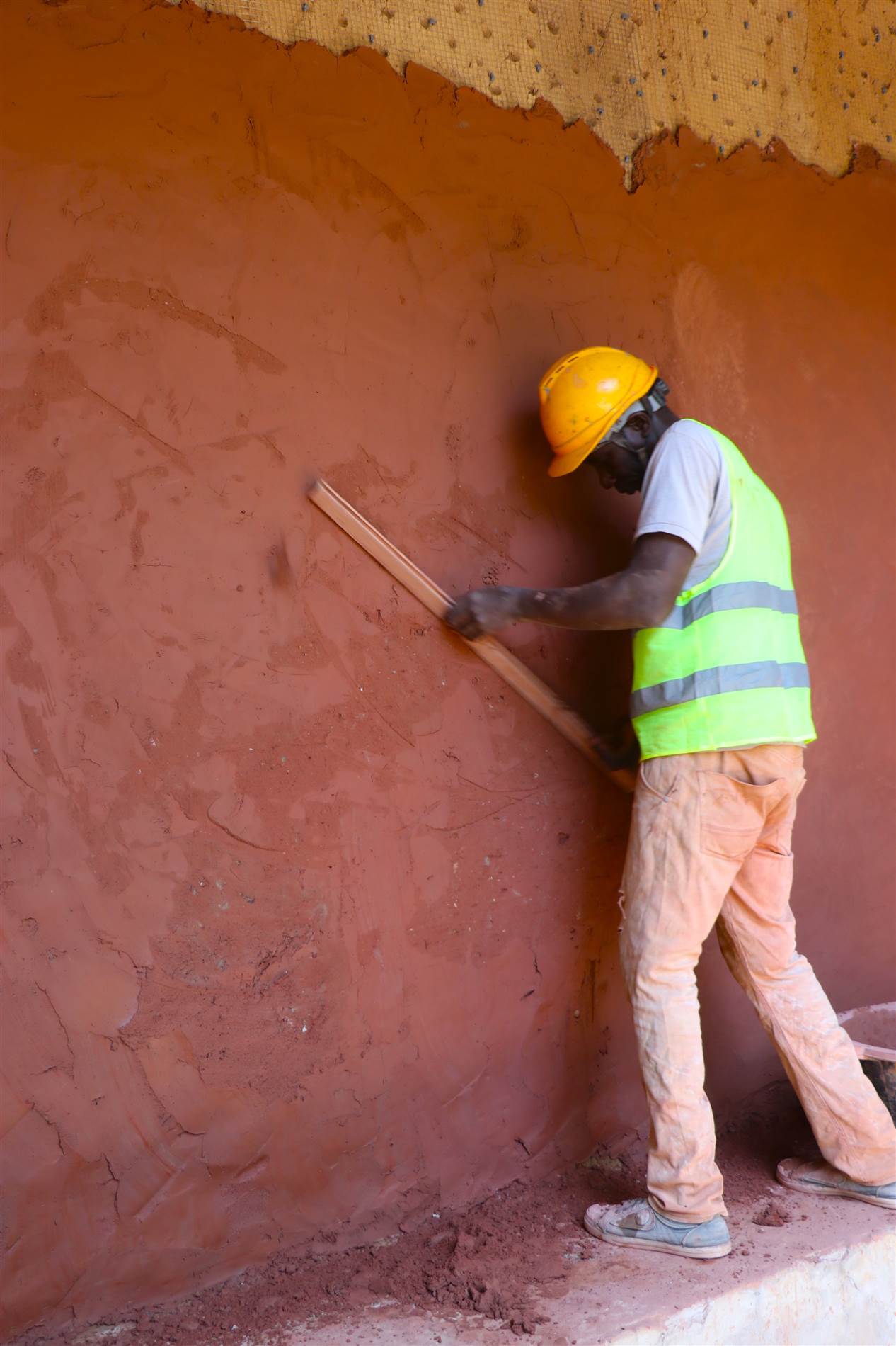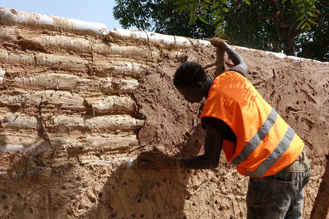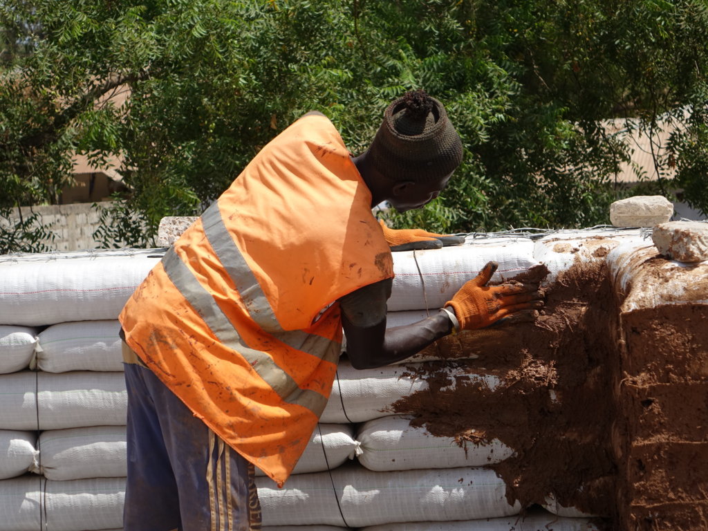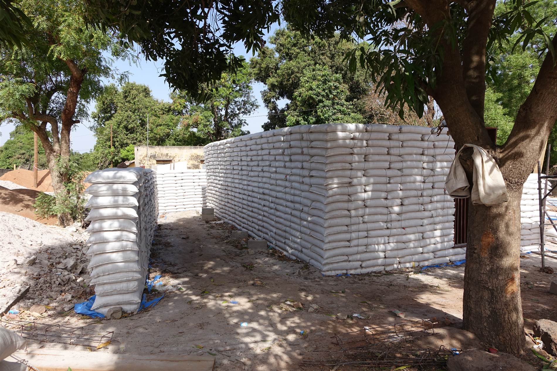 Los muros, con más de 70 cm de grosor, mantienen los espacios interiores 10–15°C más frescos que el exterior, garantizando el confort incluso en el clima saheliano. El sistema es sencillo: cada saco de 150 kg se llena con arena local, se compacta en encofrados metálicos dimensionados para la obra y se asegura con alambre de espino. Las paredes se nivelan y acabanmanualmente, combinando métodos tradicionales con innovaciones modernas.