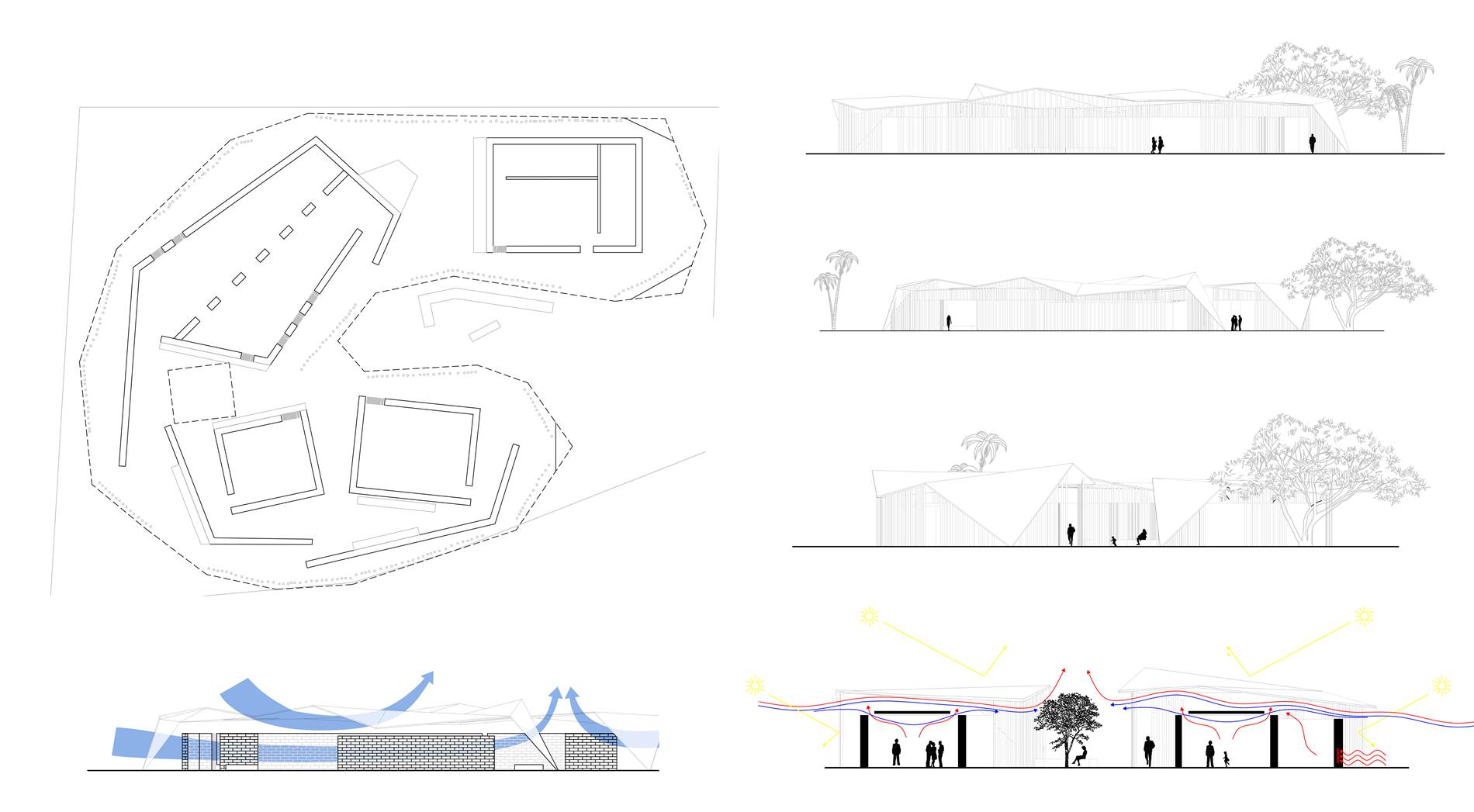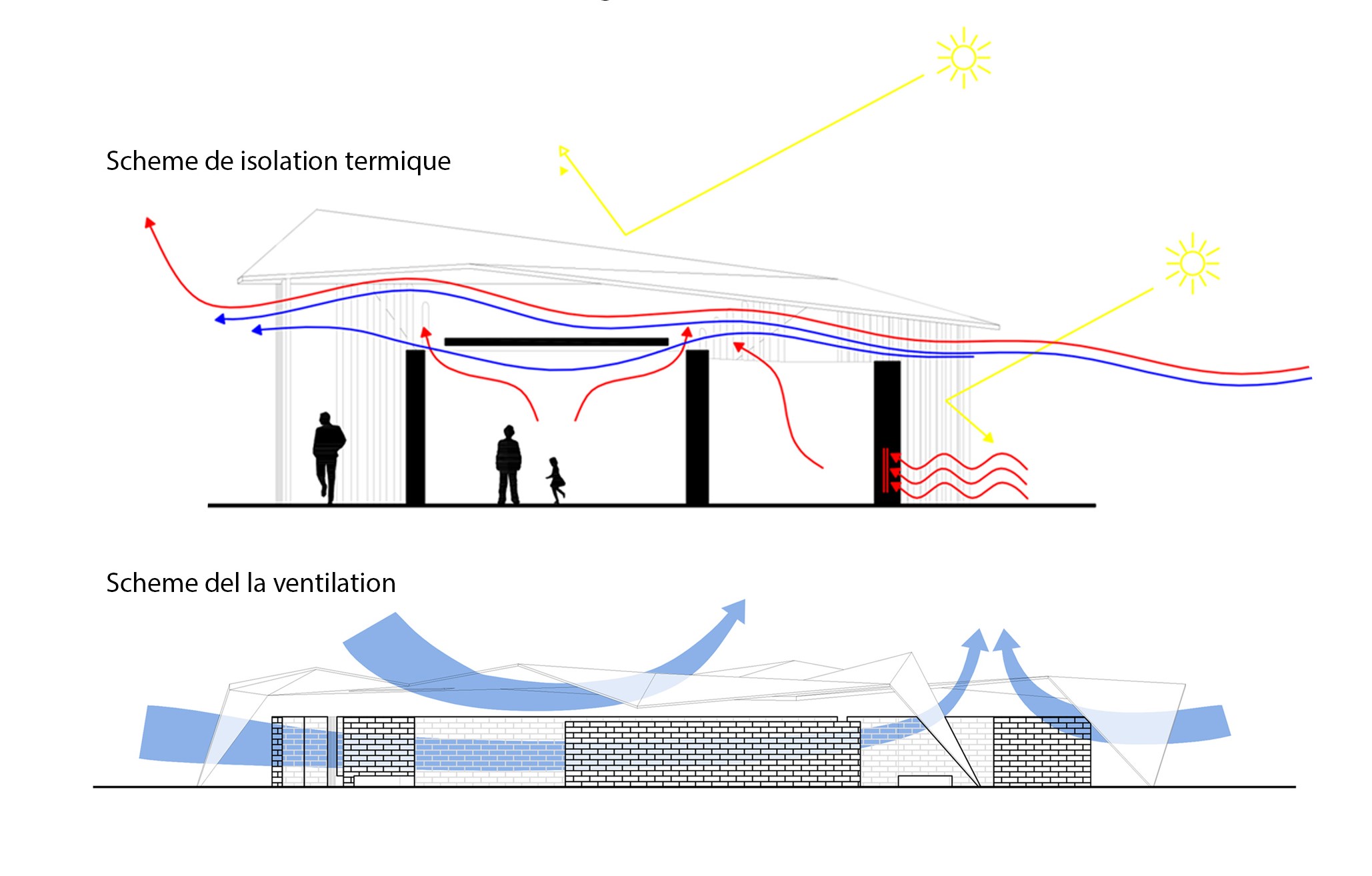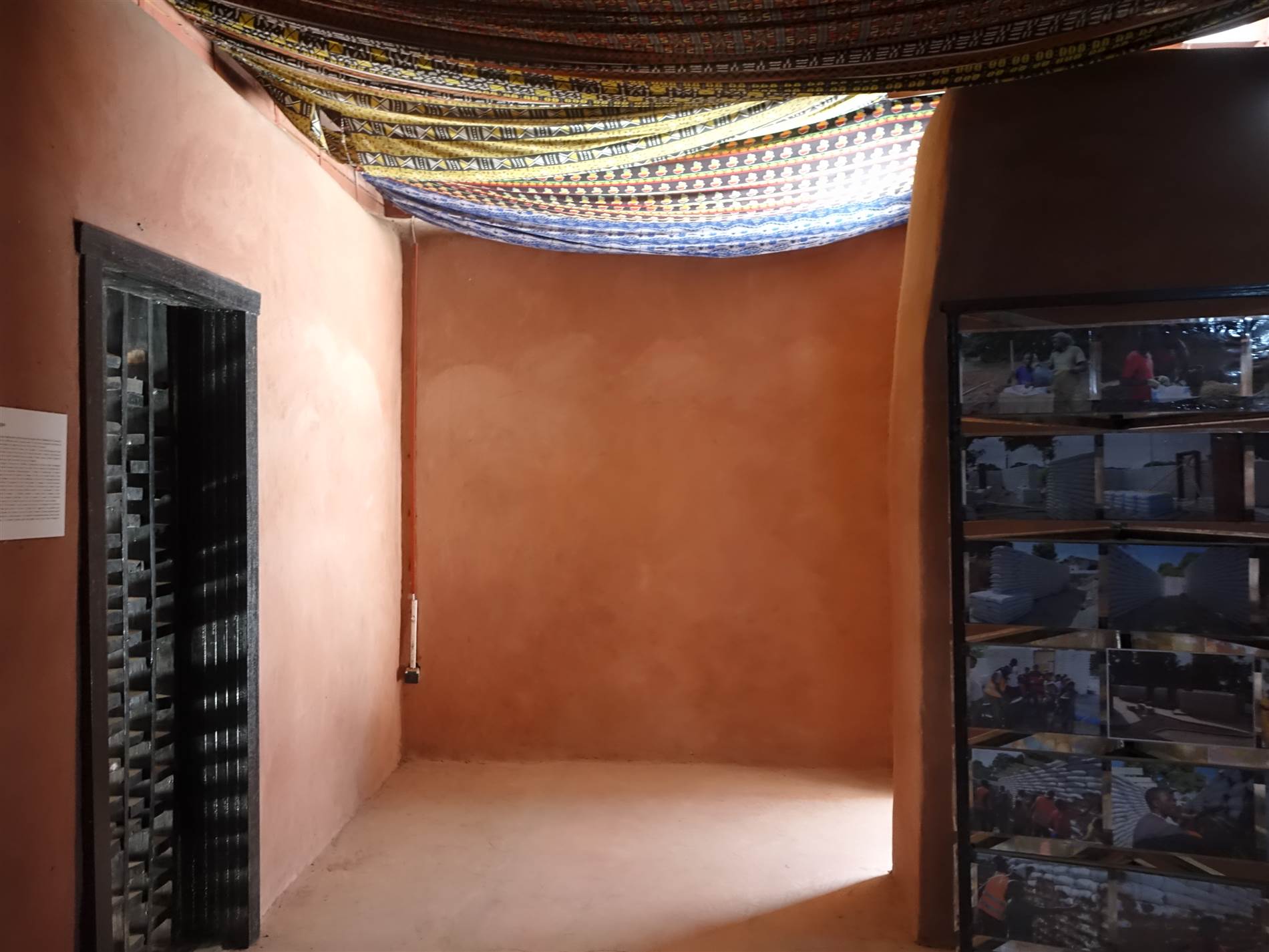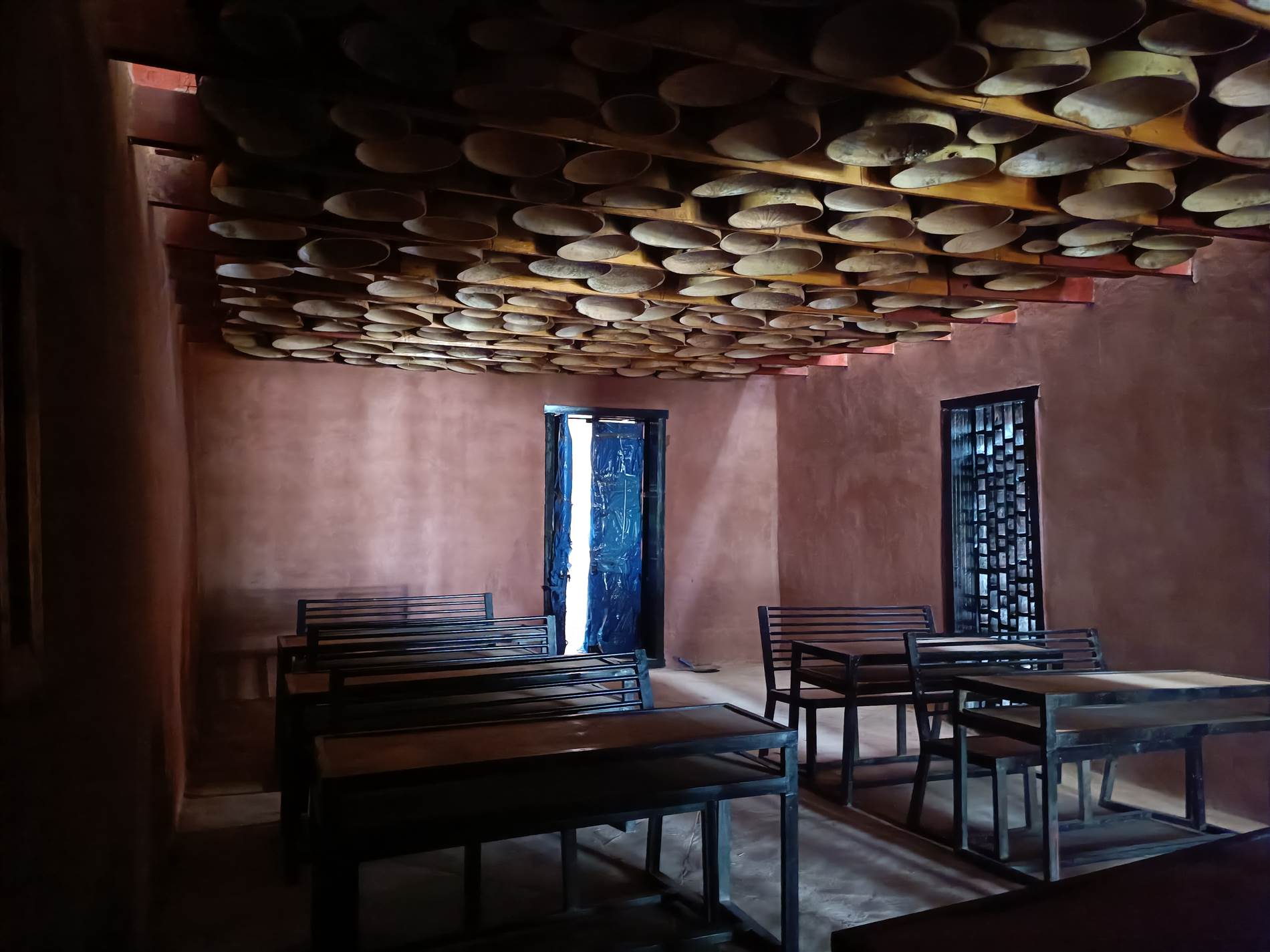 El acabado exterior, hecho de arcilla estabilizada mezclada con paja y arena, se trata con cemento al 5% y aceite de cacahuete como repelente natural al agua. La madera proviene de fuentes controladas, para prevenir la deforestación ilegal, se plantaron nuevos árboles alrededor del lugar para restaurar la sombra y la biodiversidad. La ventilación natural bajo el techo garantiza un flujo de aire pasivo y un alivio térmico, eliminando la necesidad de refrigeración mecánica.