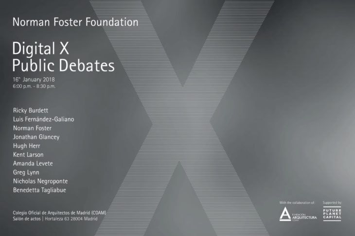 El 16 de enero tendrá lugar en el COAM un debate abierto al público en torno al encuentro entre el mundo digital y la arquitectura. Comenzará con una conferencia de Nicholas Negroponte, para dar paso a continuación a un Diálogo entre Hugh Herr y Kent Larson, moderado por Ricky Burdett, al que le seguirá el debate entre Greg Lynn y Benedetta Tagliabue, moderador por Luis Fernández-Galiano; y finalizará con el protagonizado por Norman Foster y Amanda Levete, moderado por Jonathan Glancey.