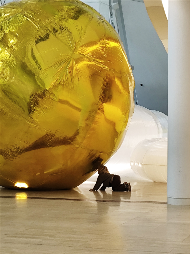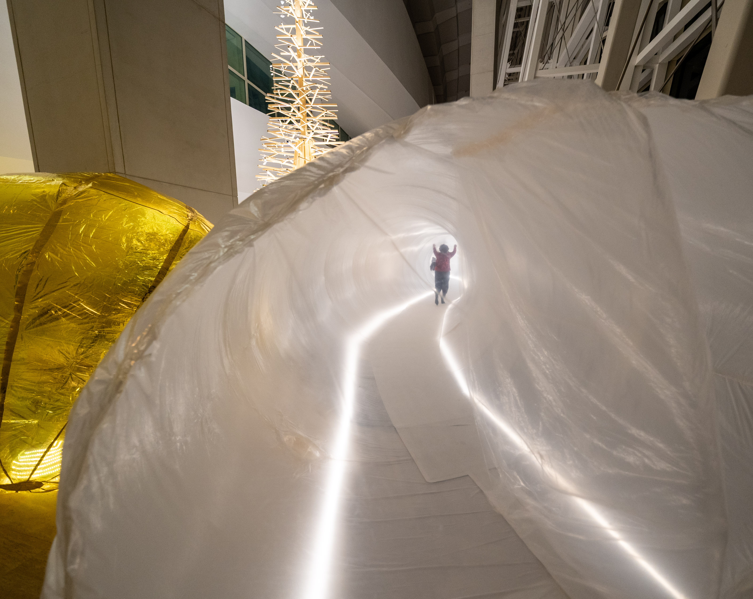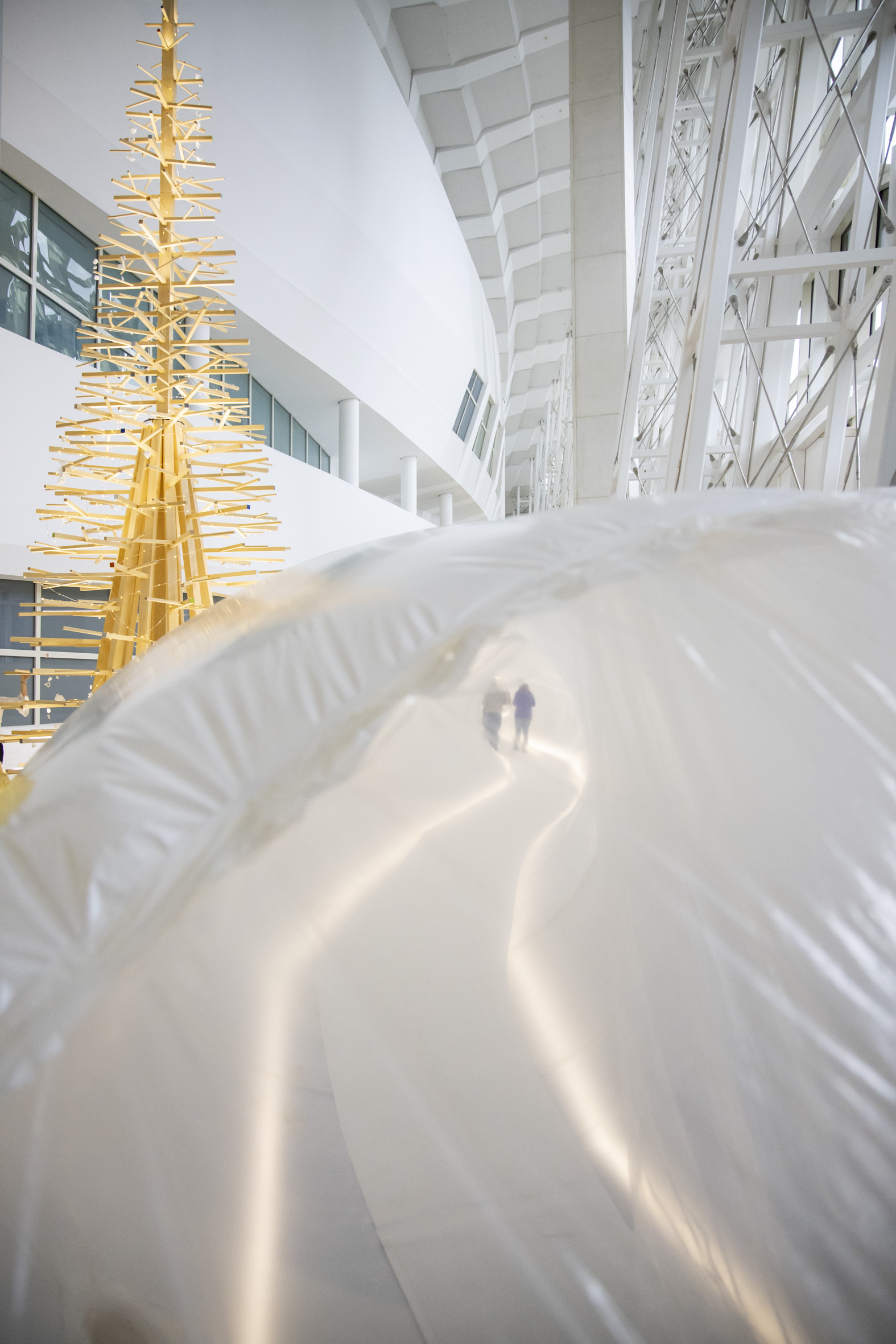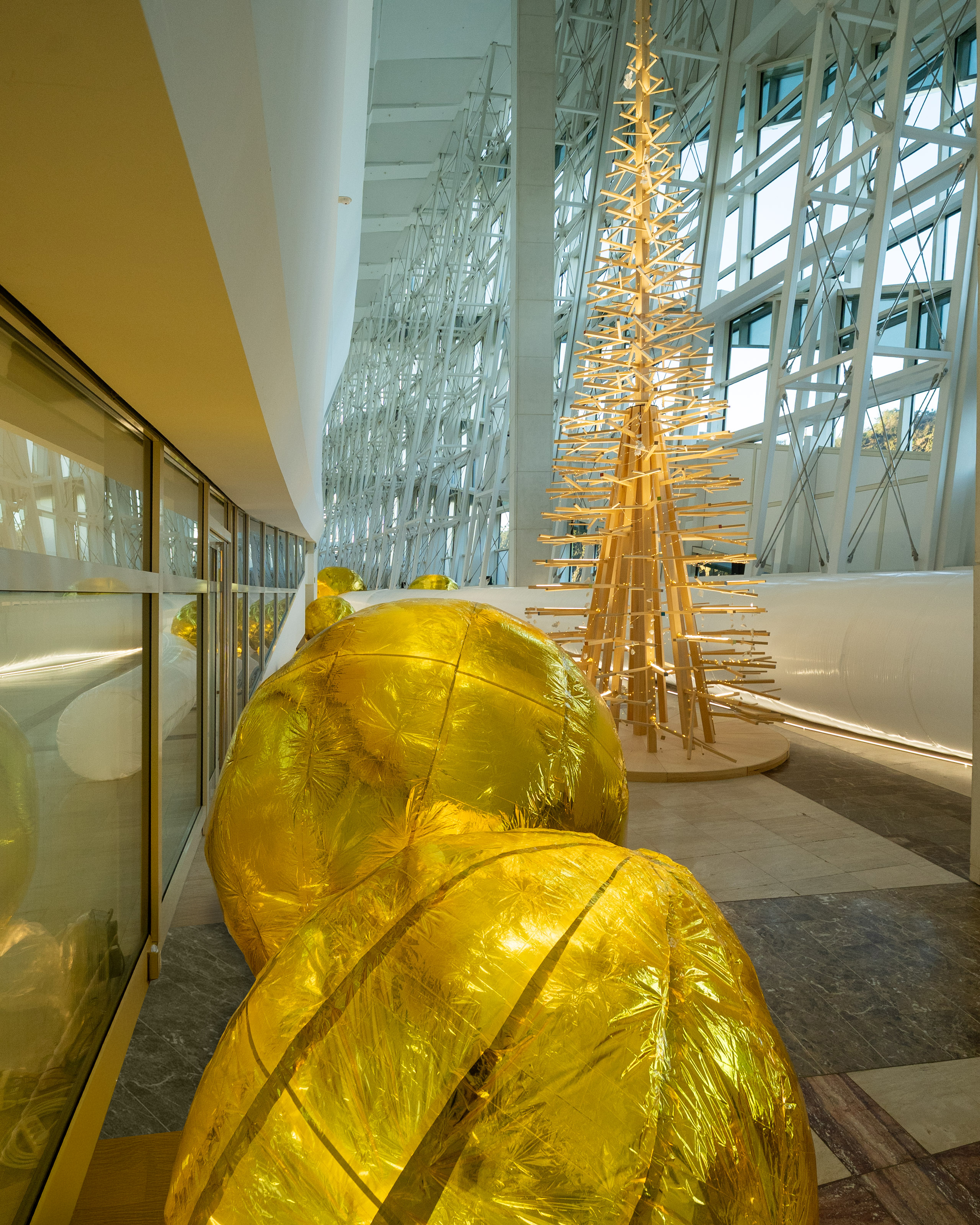 La propuesta se articula como un contraste perceptivo: frente a la rigidez de la madera del gran árbol central, emerge un paisaje blando de pasillos transitables y esferas doradas traslúcidas. Es una arquitectura que "transpira" y se mueve, que invita a ser recorrida por el interior para recuperar sensaciones primarias, mientras la luz y el sonido abstracto completan una experiencia puramente fenomenológica.