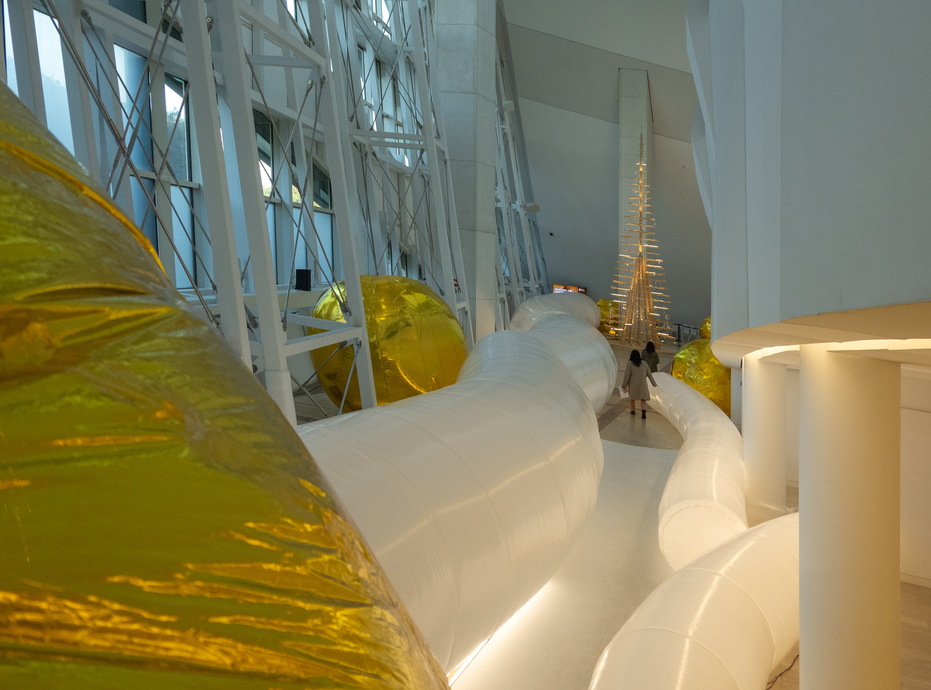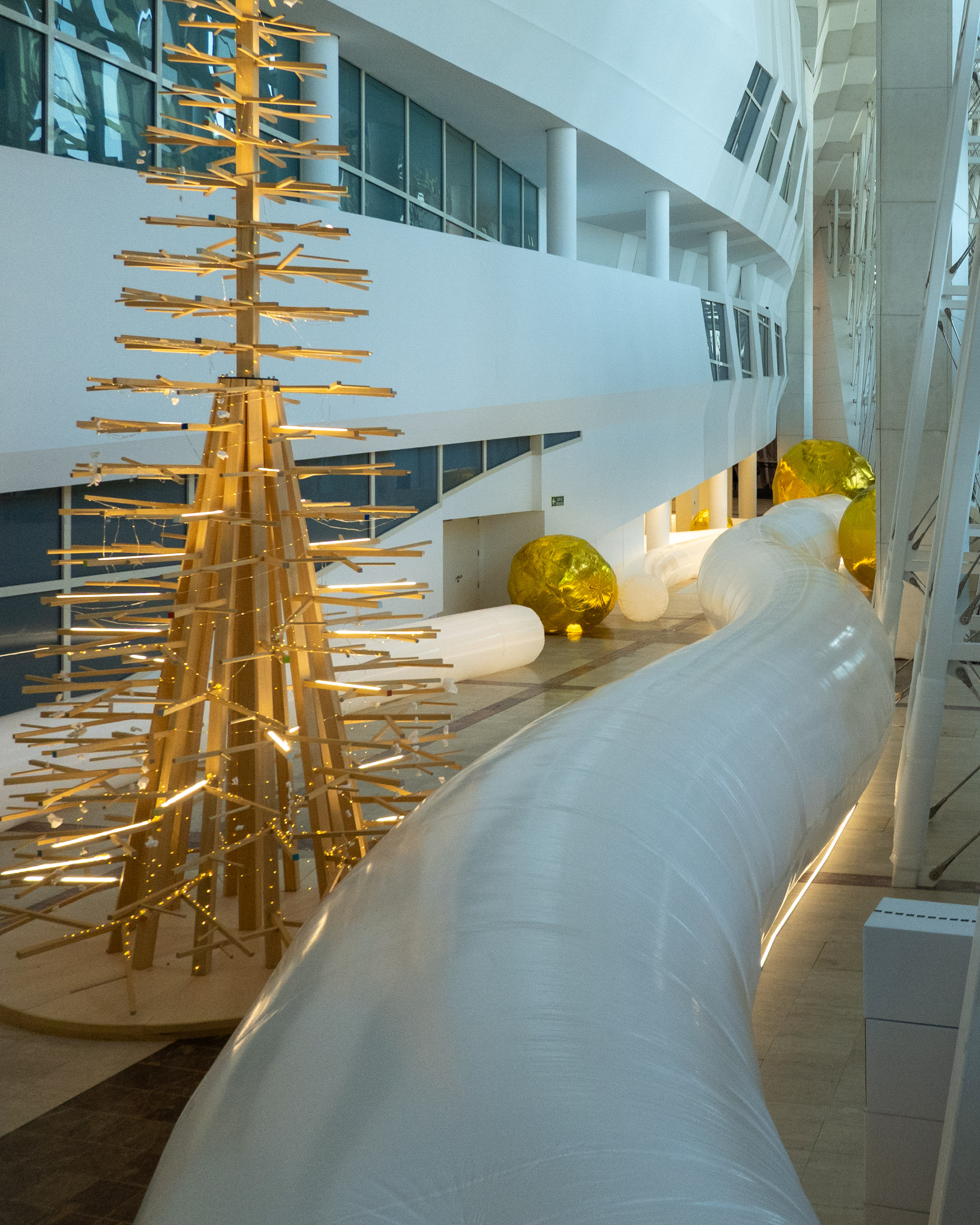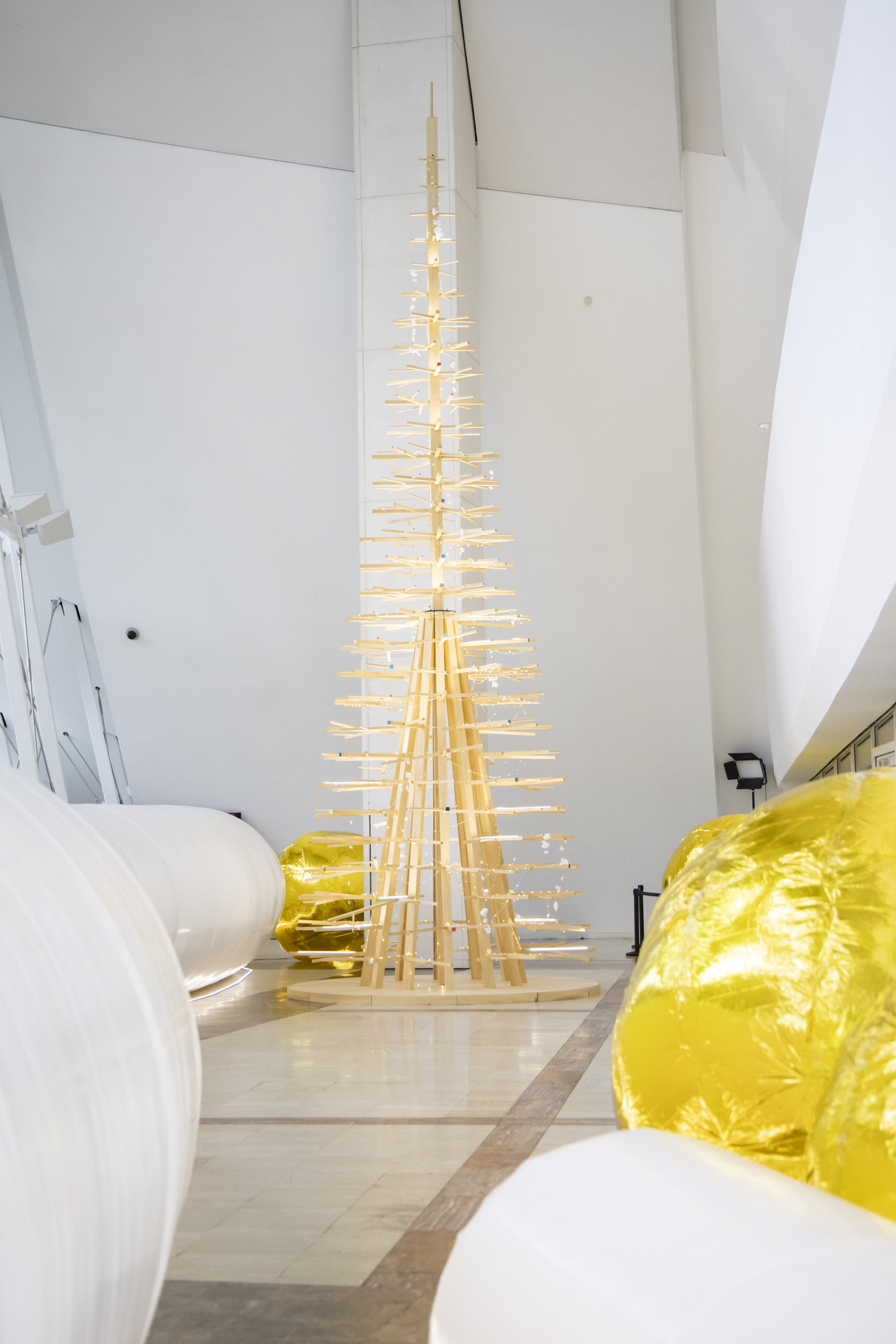 El proyecto construye una atmósfera que evoca la memoria de la Navidad a través de un conjunto de inflables que forman un paisaje blanco, con enormes bolas doradas traslúcidas que iluminan el conjunto. El árbol de Navidad de la Cidade da Cultura, emerge creando un gran contraste perceptivo entre la madera del árbol y la flexibilidad del plástico. Pero, además, la instalación permite ser recorrida por el interior, y formar parte de ella. Con el sobrante del material utilizado para construir las membranas que dan forma al proyecto, se realizarán los adornos para el árbol, emulando una decoración tradicional de la posguerra, en la que se colocaban palomitas en un hilo simulando ser copos de nieve.
