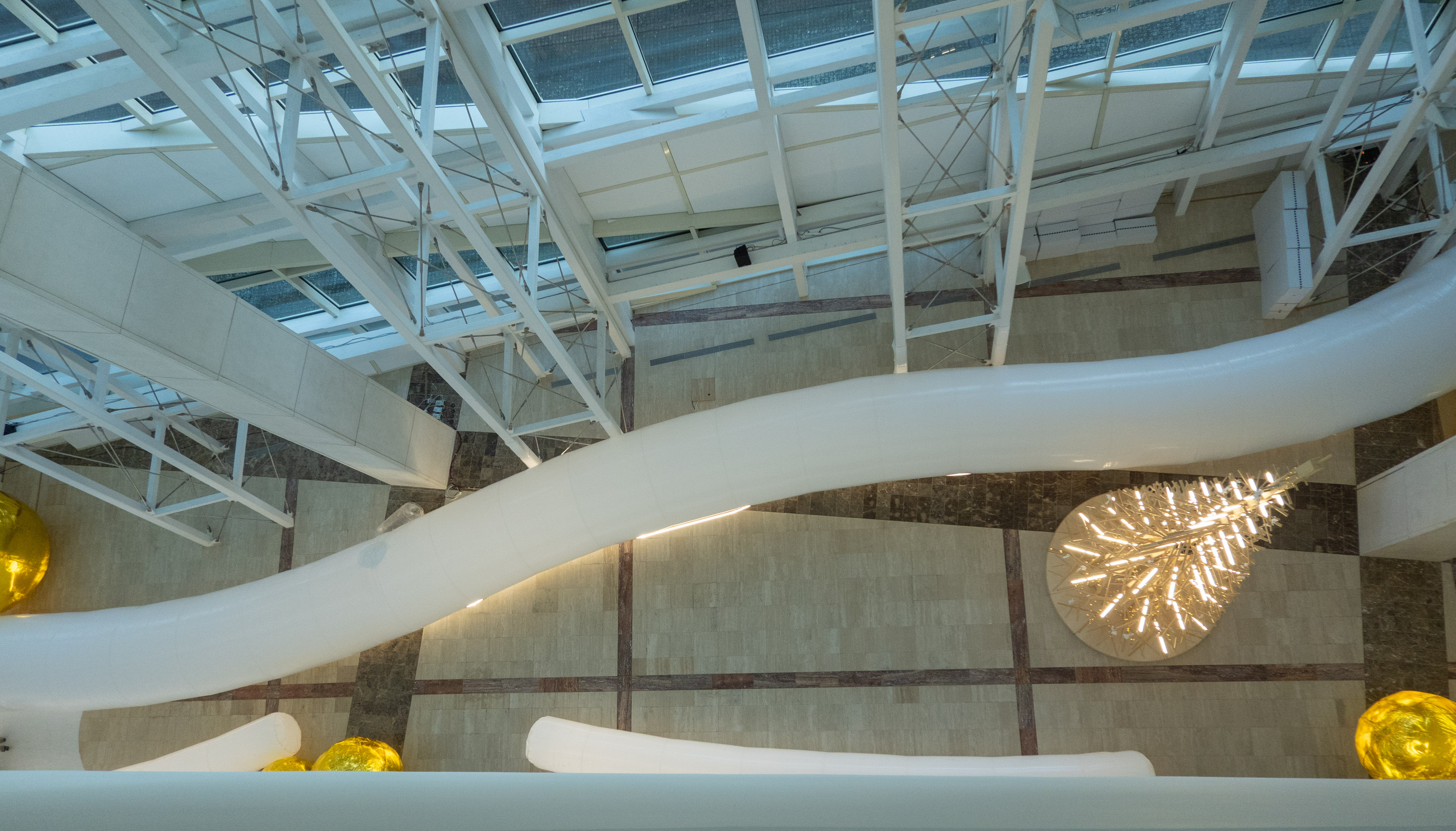 La instalación está formada por dos elementos fundamentales, además del pino preexistente en el edificio. Se utilizan bolas y pasillos, construidos con plástico reciclable de galga200. Existen cuatro elementos longitudinales, tres de los cuales tienen una sección de 1m de diámetro, mientras que el restante tiene una sección de 2,10m. Sus longitudes son variables, de 15 a 18m los de menor sección, a 55m el de mayor sección. El elemento longitudinal de sección grande es transitable por su interior, siendo accesible a través de una puerta tipo ‘hermafrodita’ en uno de sus extremos. Este culmina en el extremo opuesto con una bola dorada de 4m de diámetro. Este pasillo incorpora una moqueta inferior para facilitar el tránsito. Estos elementos se iluminan mediante luminarias frías (5000K) de intensidad media (120W/ml). Por seguridad, la iluminación de la pieza transitable será exterior, colocándose en una zona no-transitable protegida mediante perfilería con difusores. Las bolas están construidas con plástico tipo kraft en dimensiones variables que se iluminan interiormente con luminarias cálidas (2800K) de baja intensidad (50-100W)