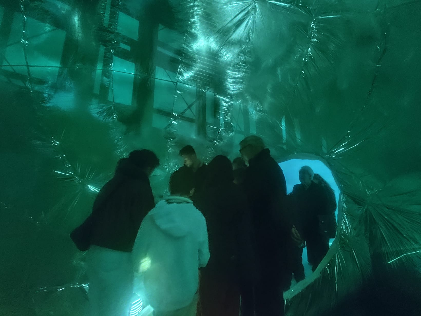 Ya que se trata de una arquitectura sensorial, el proyecto incorpora luz, olor y sonido, mediante música abstracta atmosférica. Además, se añade una proyección de nieve cayendo situada en el muro que cierra la sala, acentuando la idea abstracta/navideña del conjunto.