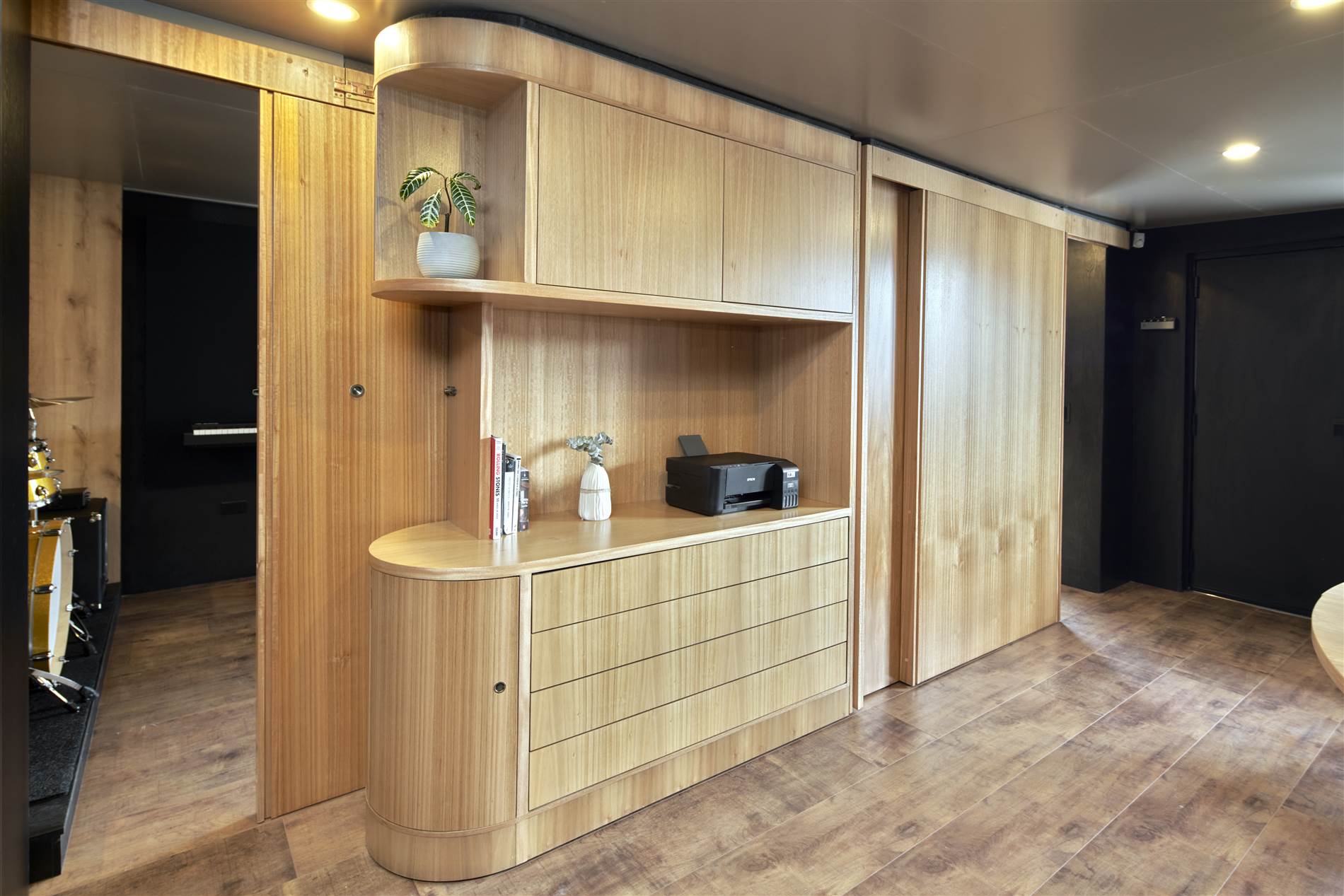 El espacio se extiende o comprime, según las necesidades del usuario. Al comprimirse, se comporta como un mueble o estantería. Al extenderse se convierte en un espacio habitable que contiene todo lo necesario para cumplir con sus diferentes funciones, como oficina/despacho de trabajo, estudio de yoga, espacio de relax, taller, sala de reuniones, cuarto de huéspedes, etc. Permite la flexibilidad de uso tanto en su interior, como el aprovechamiento del espacio exterior (al comprimirlo), mostrándose respetuoso con el entorno.