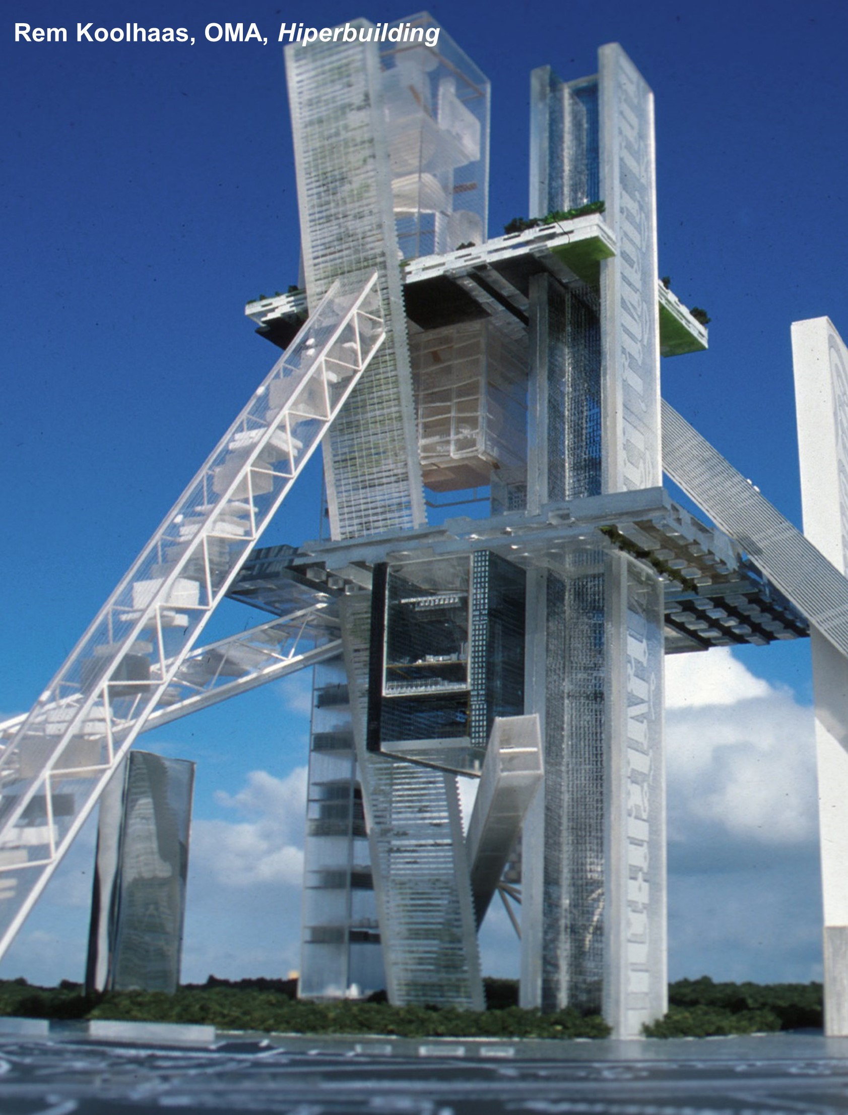 El contrapunto irónico y distópico llega con Rem Koolhaas (Exodus e Hyperbuilding), que subvierte las promesas libertarias. Exodus es una sátira sobre el confinamiento voluntario en una "zona de excelencia arquitectónica", mientras que Hyperbuilding encarna la megainfraestructura total como sistema de supervivencia en la saturación urbana.