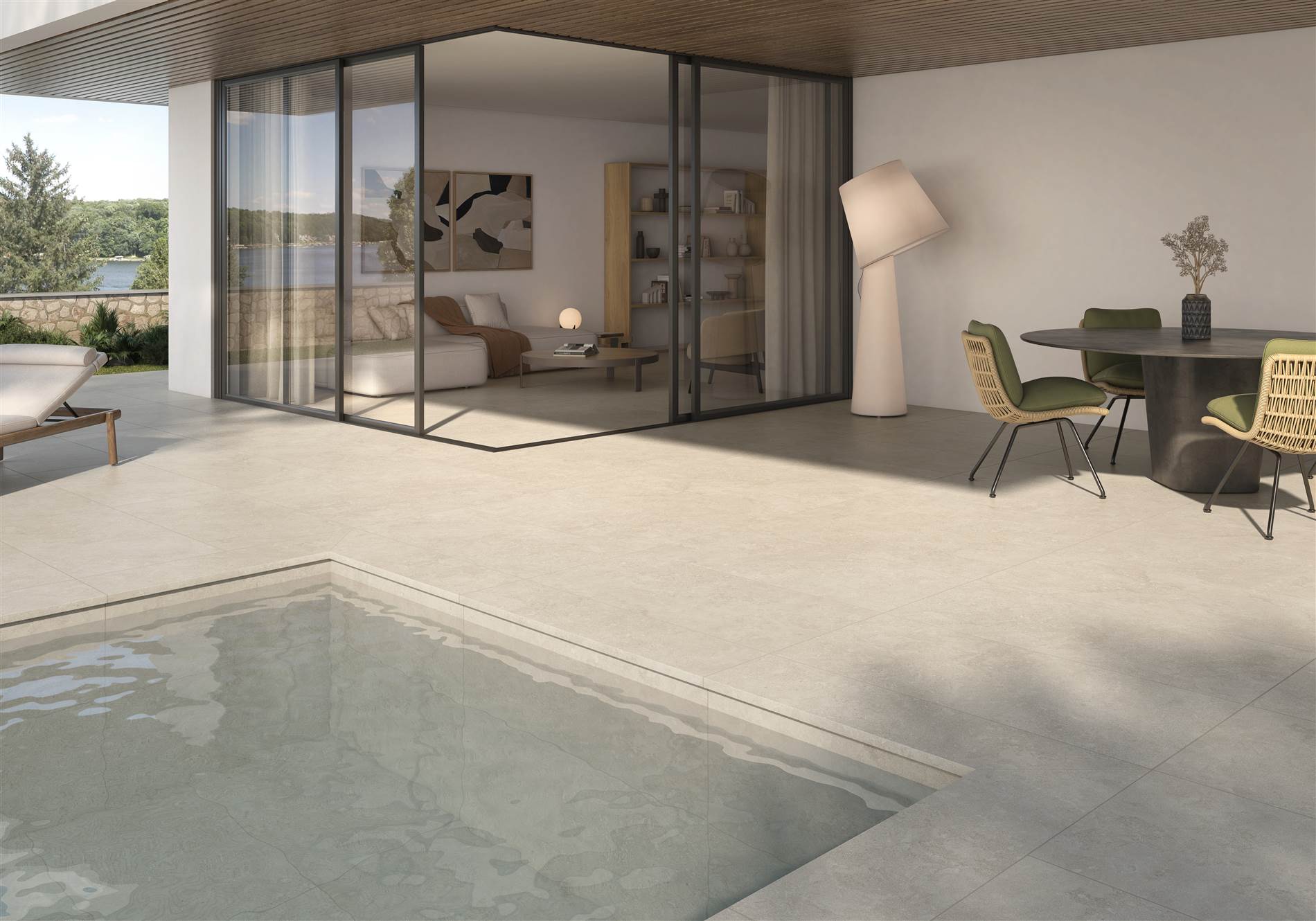 Arizona: una colección de gres porcelánico efecto piedra diseñada para superficies continuas en terrazas y piscinas. Sus tonos Arena y Hueso incluyen un tratamiento antipatógeno que garantiza la máxima higiene en espacios de uso público y piscinas en para los que aporta todas las piezas especiales: peldaño recto, zanquín, rodapié y tabica.