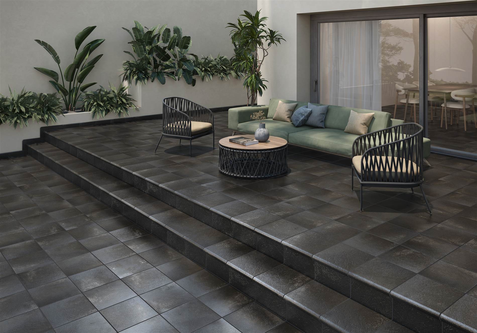 Metal: Esta gama de gres extrusionado esmaltado aporta un carácter industrial con sus acabados Black y Red (formato 33 x 33 cm) y resistencia Clase 2 al deslizamiento (CTE).