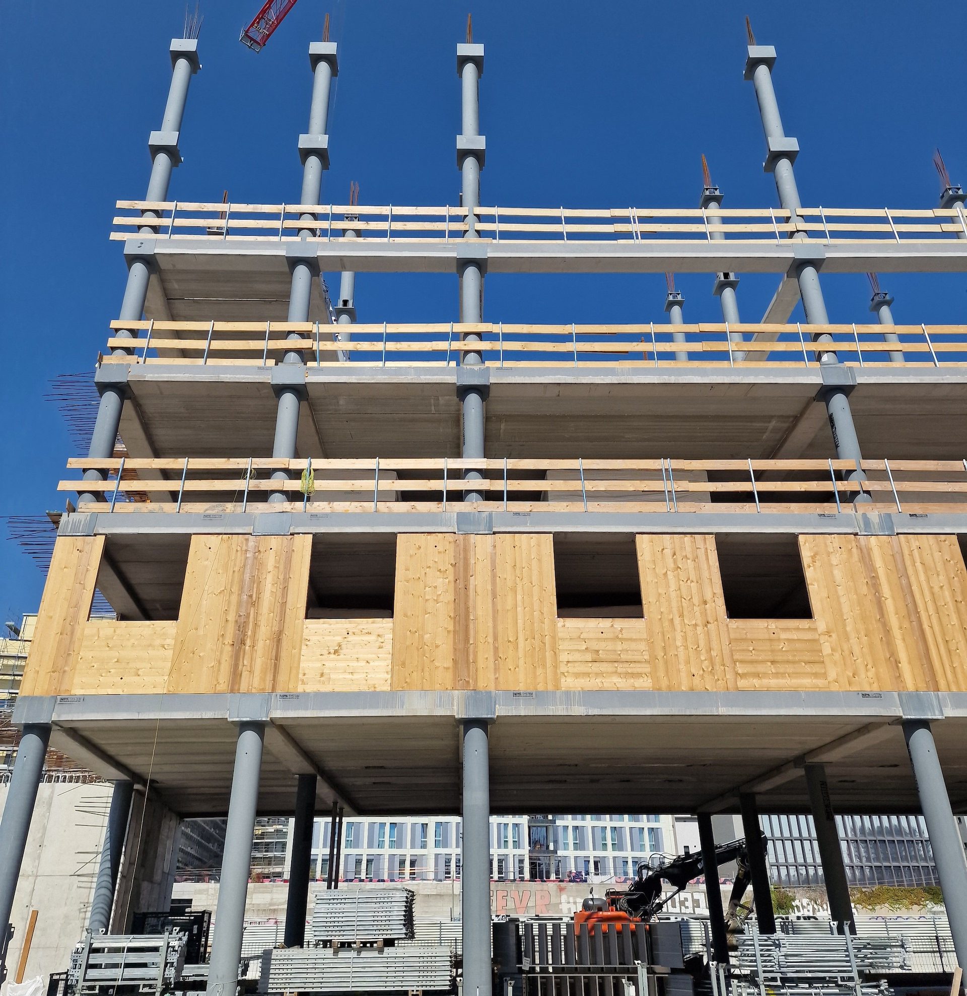 Una innovación importante en esta obra ha sido que, para lograr ajustar los tiempos del proceso constructivo, Xlam Dolomiti desarrolló un manipulador de paneles que facilita y agiliza el movimiento y la colocación de estos elementos en obra.