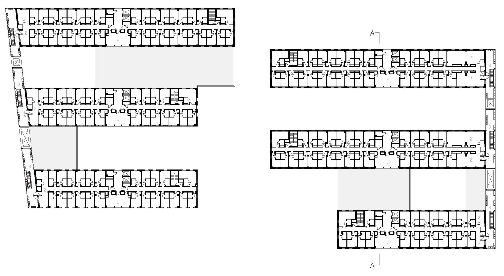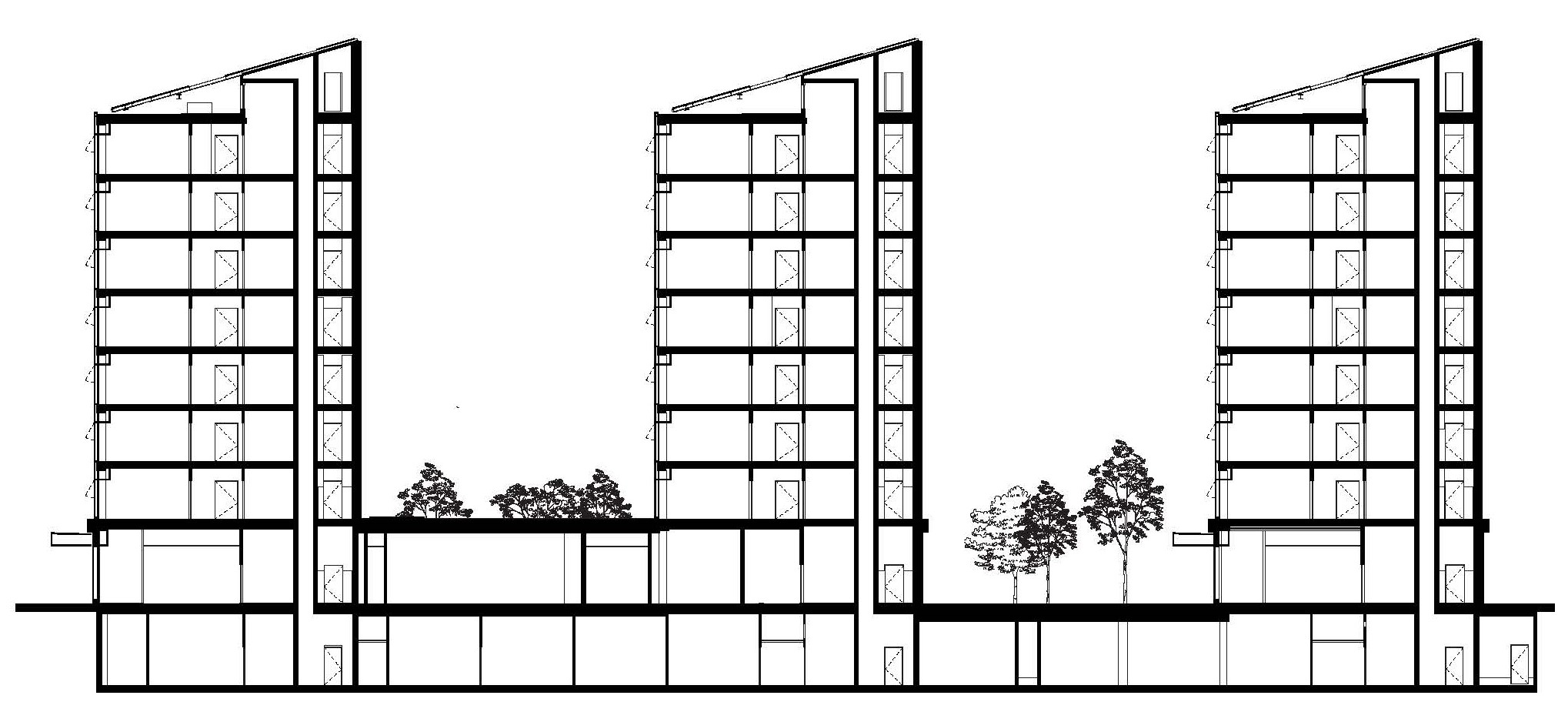 Plantas tipo: 1. Cocinas comunitarias; 2. Salas de estudio; 3. Terrazas comunitarias. Ver pdf.