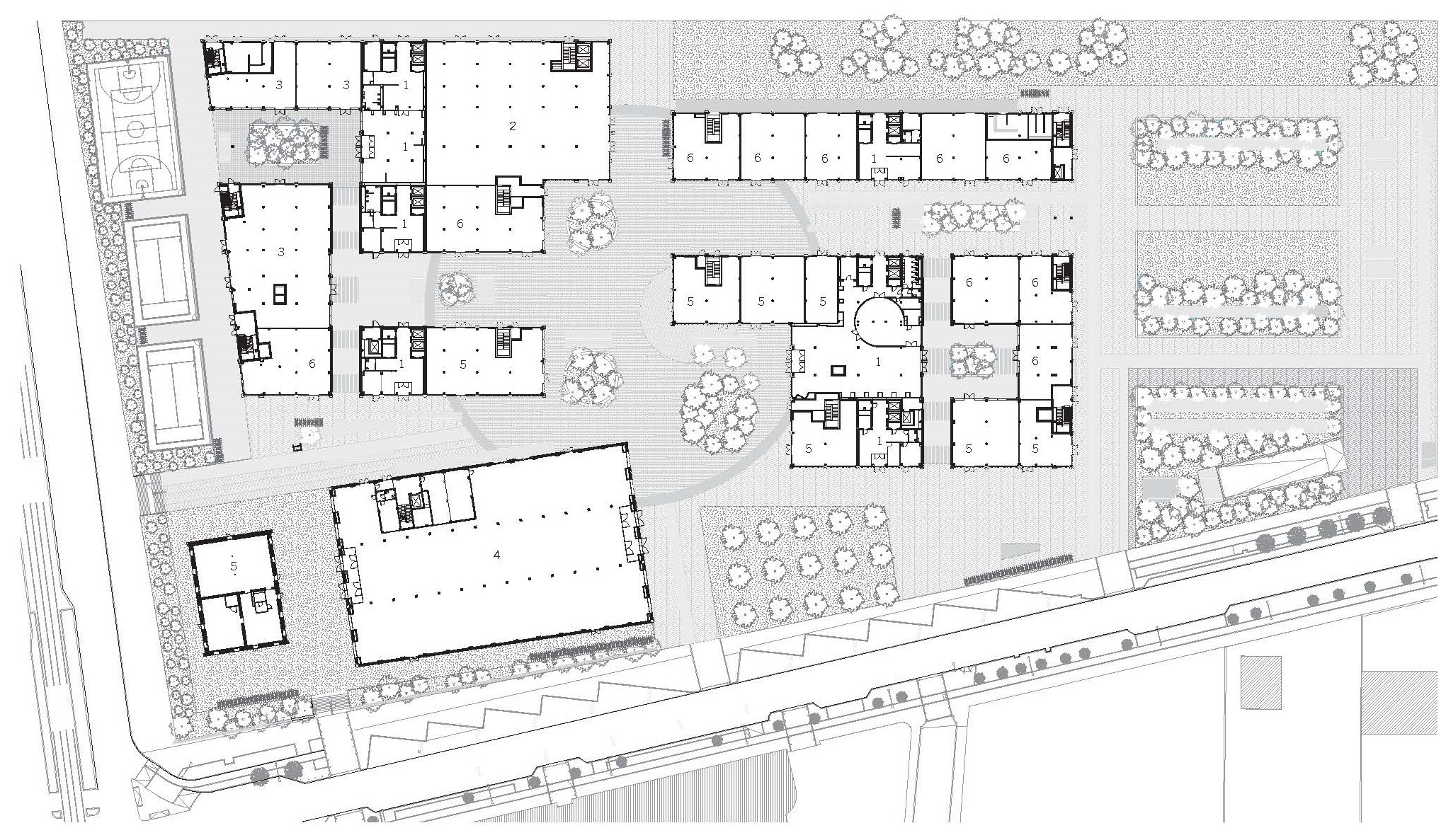 Planta baja de la Villa Olímpica: 1. Vestíbulos; 2. Gimnasio; 3. Espacios de uso flexible relacionados con la salud y el bienestar; 4. Comedor y co-working; 5. Espacios comerciales; 6. Tiendas de alimentación. Ver pdf.