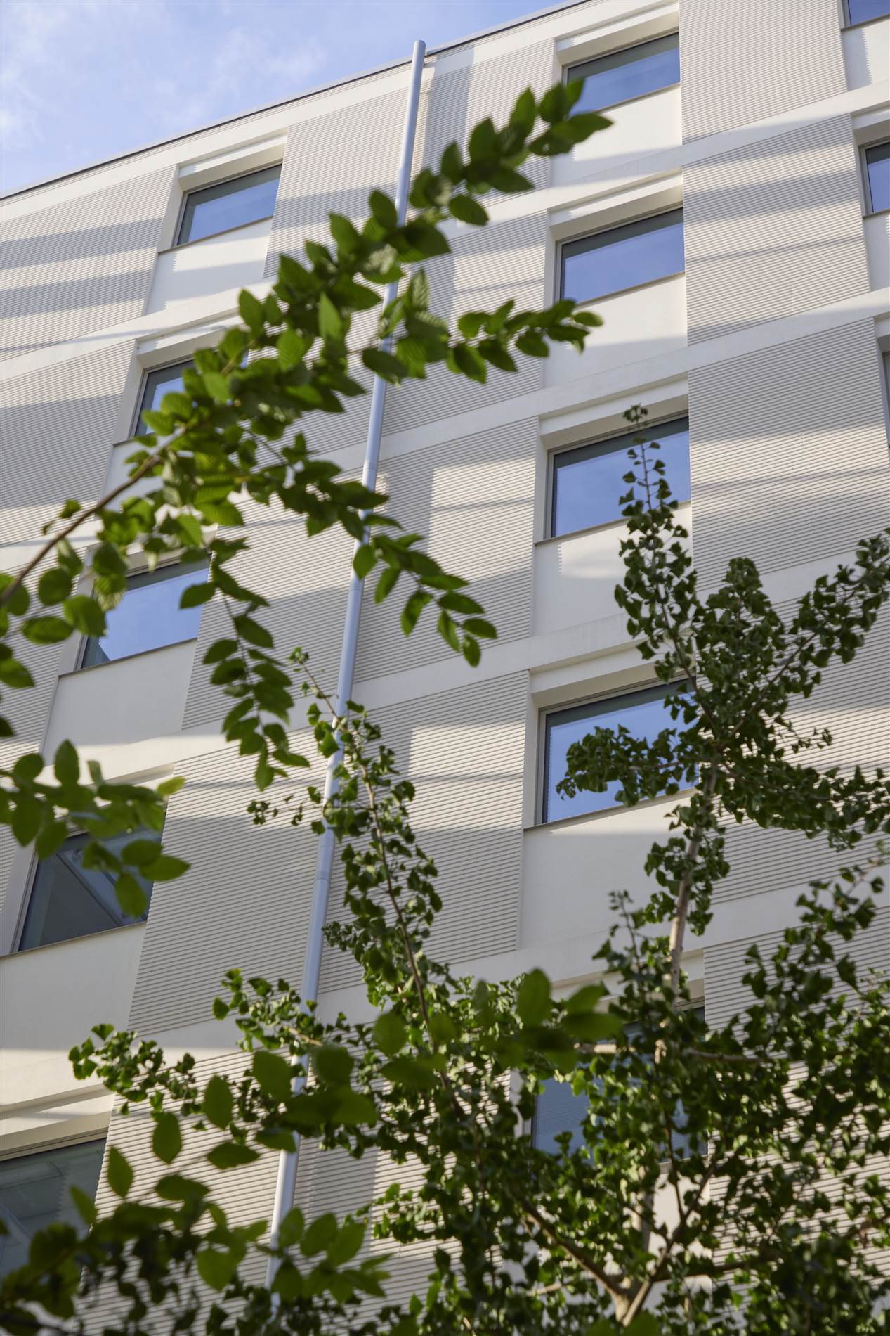 En la construcción de los nuevos edificios se ha elegido sistemas industrializados que aceleran la construcción y reducen los residuos. Una estructura mixta de acero y hormigón se cierra mediante paneles de madera contralaminada industrializada, reduciendo el impacto de carbono de la construcción. El acabado exterior matiza el proceso industrial con la textura del revoco aplicado sobre un tablero contrachapado.