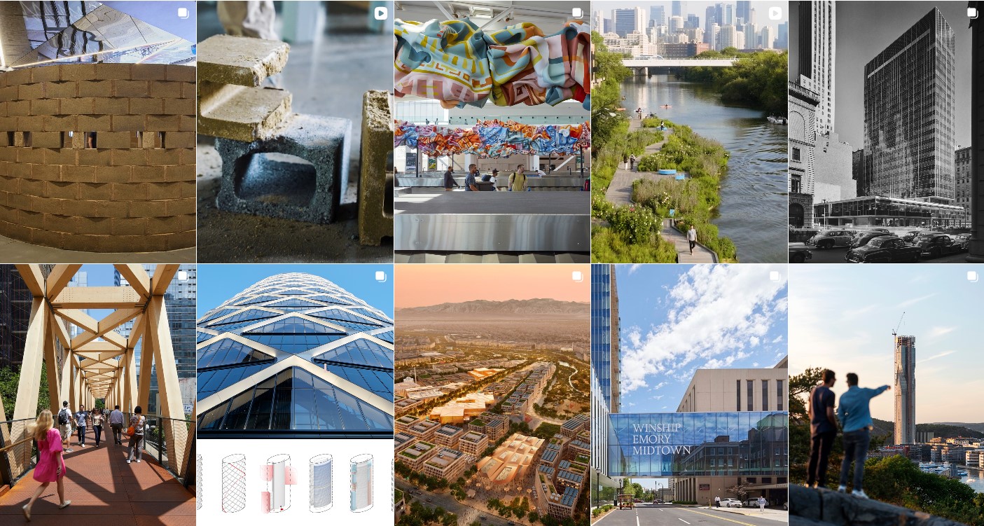 El perfil en Instagram de SOM en la que convive referencias a obras históricas del estudio, como es la Lever House en Nueva York (imagen en blanco y negro) con las investigaciones actuales que abarcan desde el desarrollo de bloques constructivos basados en algas, planes de naturalización y conexiones urbanas o la ejecución de estructuras complejas.
