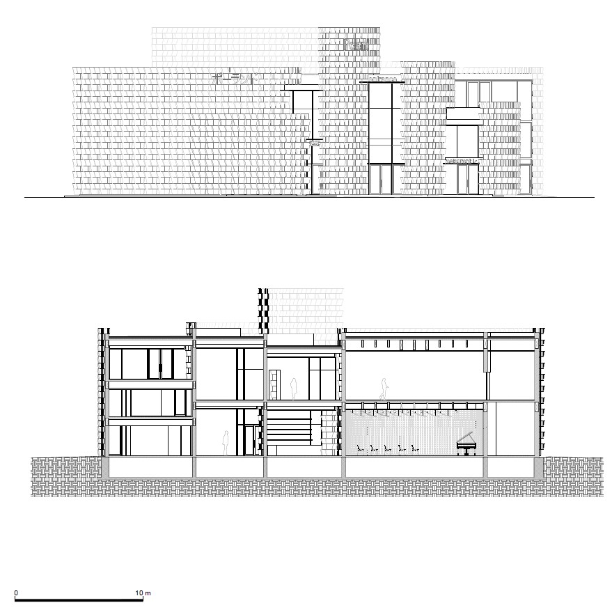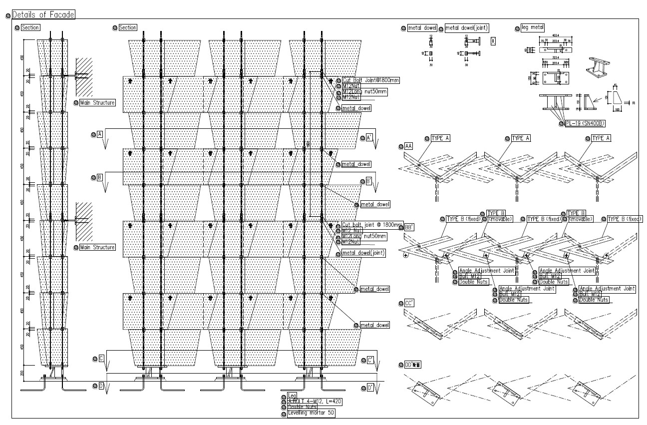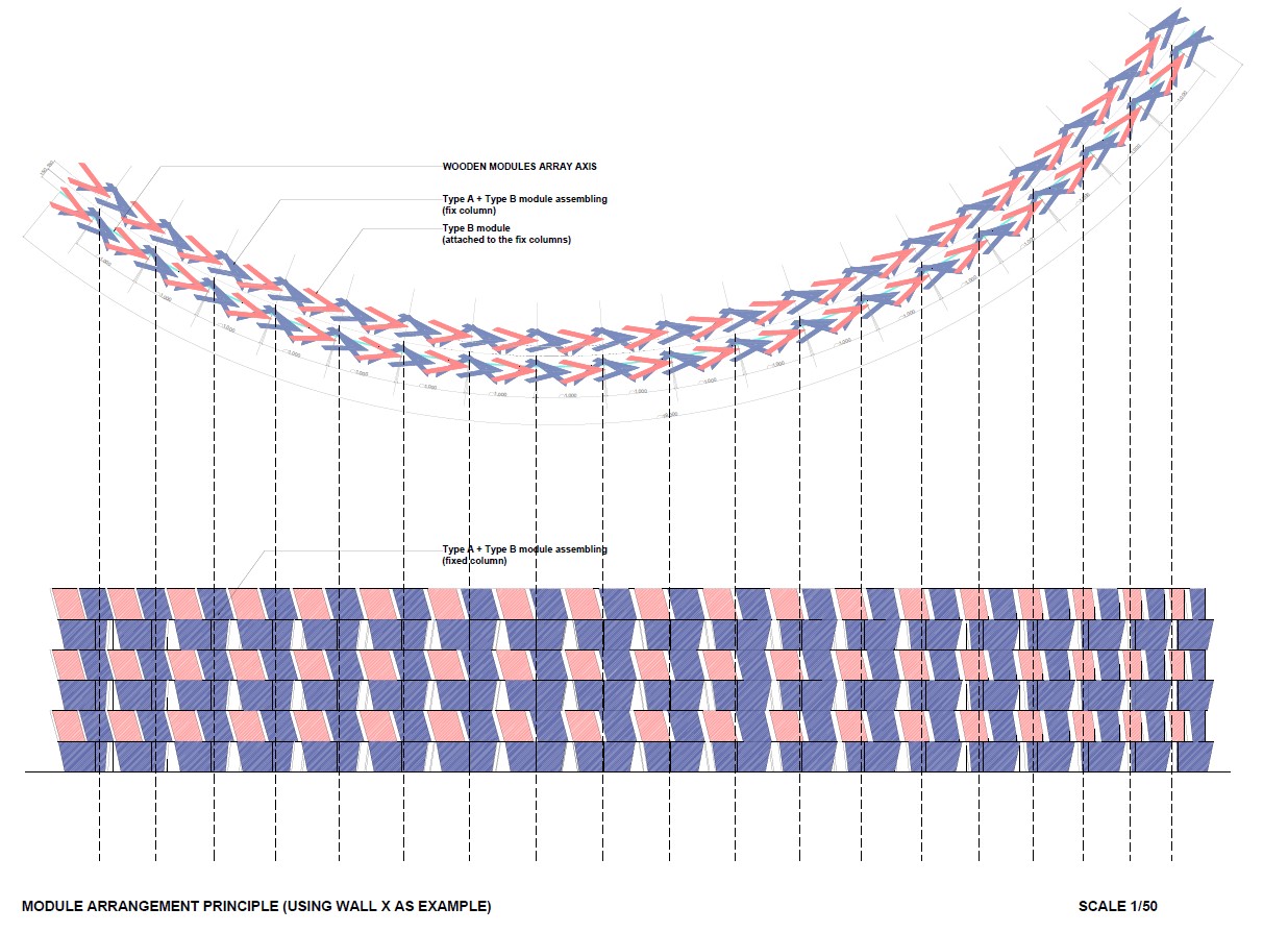 El resultado es una fachada que no funciona como un revestimiento aplicado, sino como una estructura espacial coherente, donde geometría, estructura y material convergen en un único sistema constructivo. La repetición rigurosa de un número mínimo de piezas permite construir una forma compleja con una lógica clara, en la que cada módulo es simultáneamente elemento estructural, unidad constructiva y componente arquitectónico.”1