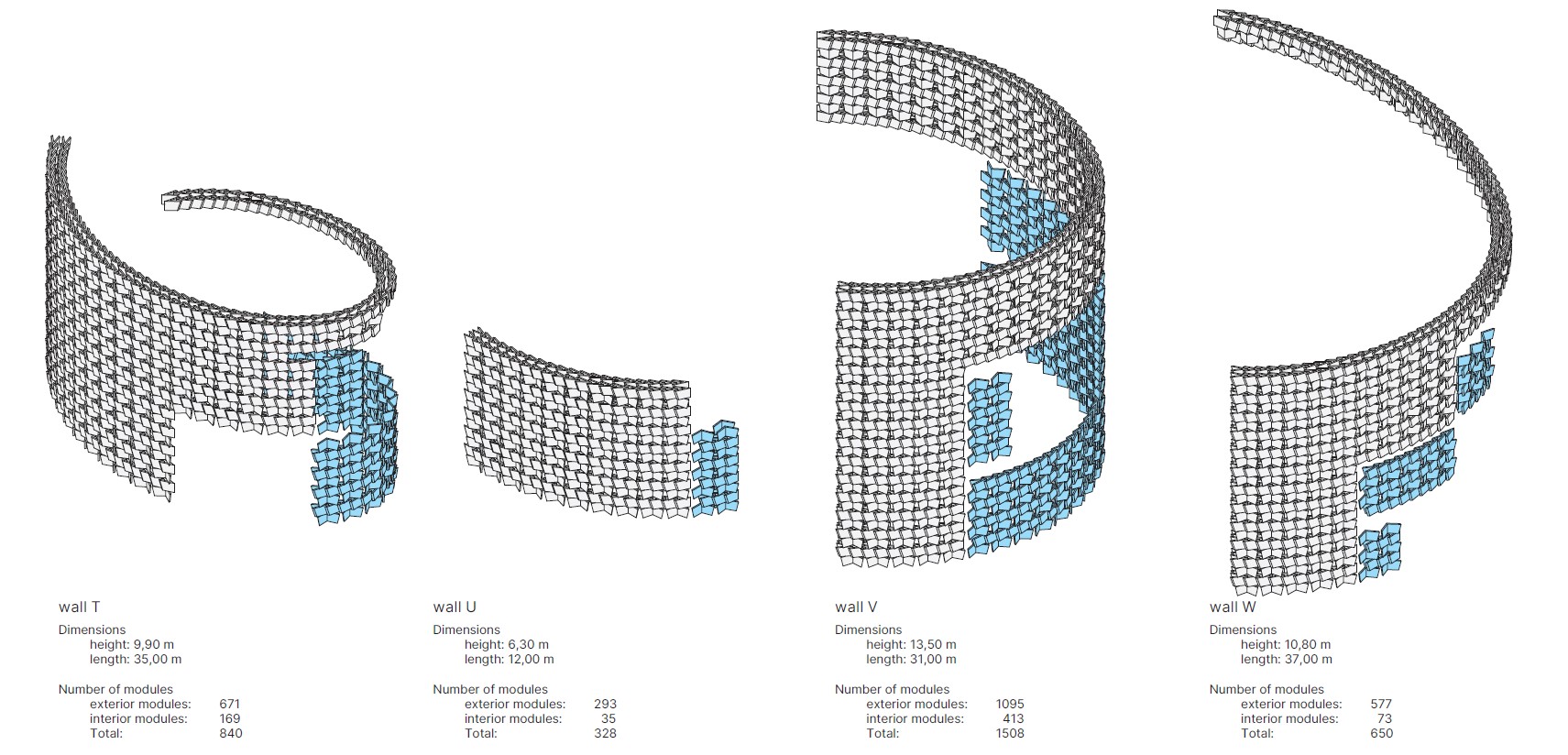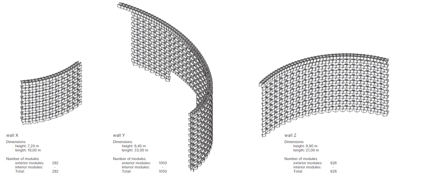 La lógica tras el primer objetivo era evidente: con más de 5.000 módulos y un plazo de ejecución extraordinariamente ajustado, la fabricación seriada no era una opción, sino una condición imprescindible. Desde el inicio, el principal reto fue geométrico. ¿Cómo lograr que un mismo módulo pudiera adaptarse a los múltiples arcos de radios variables que componen los largos brazos de la espiral, manteniendo al mismo tiempo su geometría inalterada en todo el proyecto?