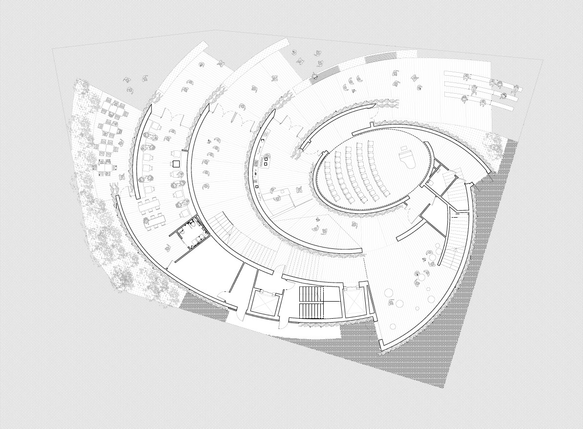 ¿Cómo representa esta geometría la identidad polaca y su espíritu de innovación? Las fronteras del territorio polaco no impiden que las ideas innovadoras se expandan, influyan en regiones lejanas y, a su vez, regresen al centro gravitacional de nuestra nación. Estas fuerzas invisibles, pero esenciales para el desarrollo del país, se expresan en la forma dinámica de los muros en espiral, con una sala de conciertos en su núcleo.”1