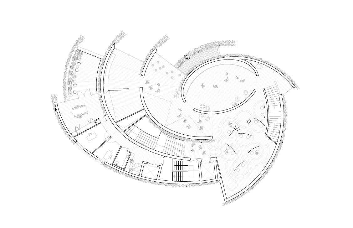 Toda estructura necesita puntos fijos que le otorguen estabilidad. Sin embargo, anclar cada porción de muro de forma específica a su arco correspondiente habría supuesto renunciar a la repetición y multiplicar exponencialmente la complejidad de fabricación y montaje. La solución surgió durante una de las reuniones de trabajo con Jun Sato, ingeniero estructural del proyecto. Frente a un dibujo de la espiral, tomó su lápiz y comenzó a inscribir ciertos módulos dentro de una serie de circunferencias. “Como una cadena de bicicleta”, dijo. La analogía resultó decisiva.