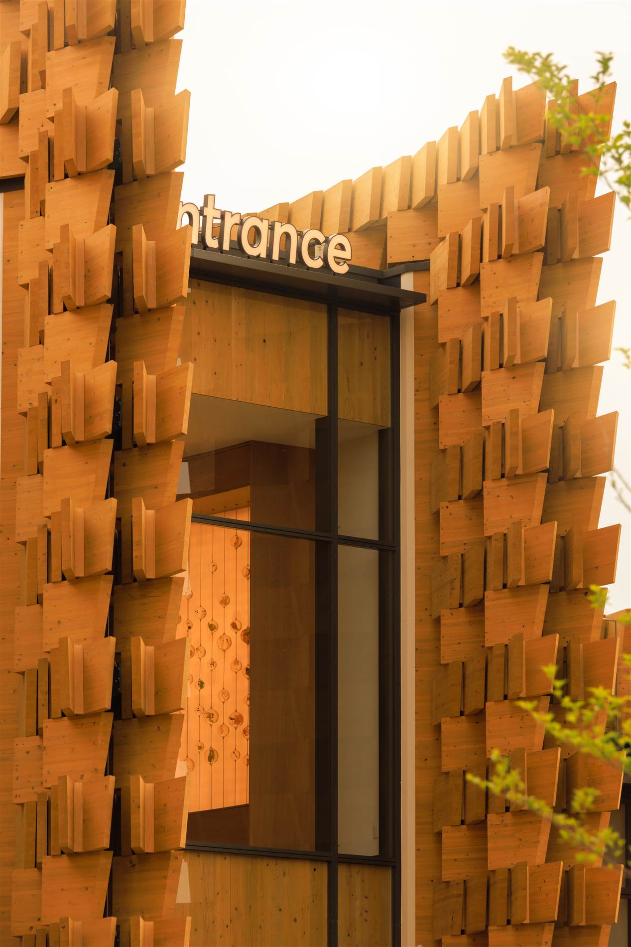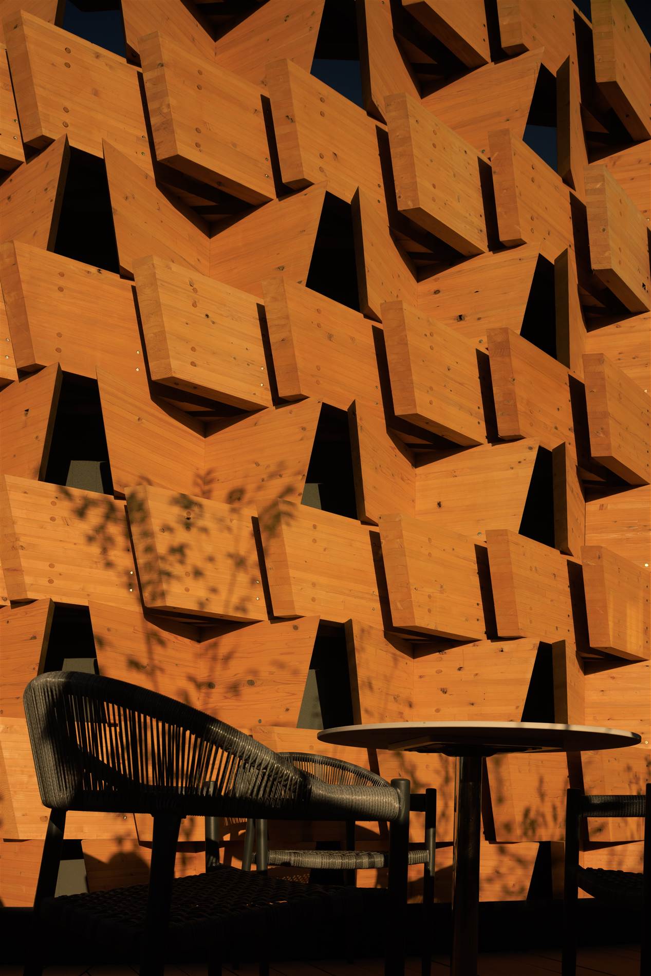 El pabellón emplea exclusivamente madera de pino local japonés, tanto en su estructura como en su envolvente, aprovechando el excelente savoir-faire de los carpinteros nipones. Se hace así un guiño a las técnicas tradicionales, reinterpretadas mediante herramientas contemporáneas. El resultado es una fachada vibrante, que bajo la luz del día cambia de aspecto por la forma en que atrapa las sombras. En el interior, la madera aporta calidez, confort sensorial e incluso una presencia olfativa.