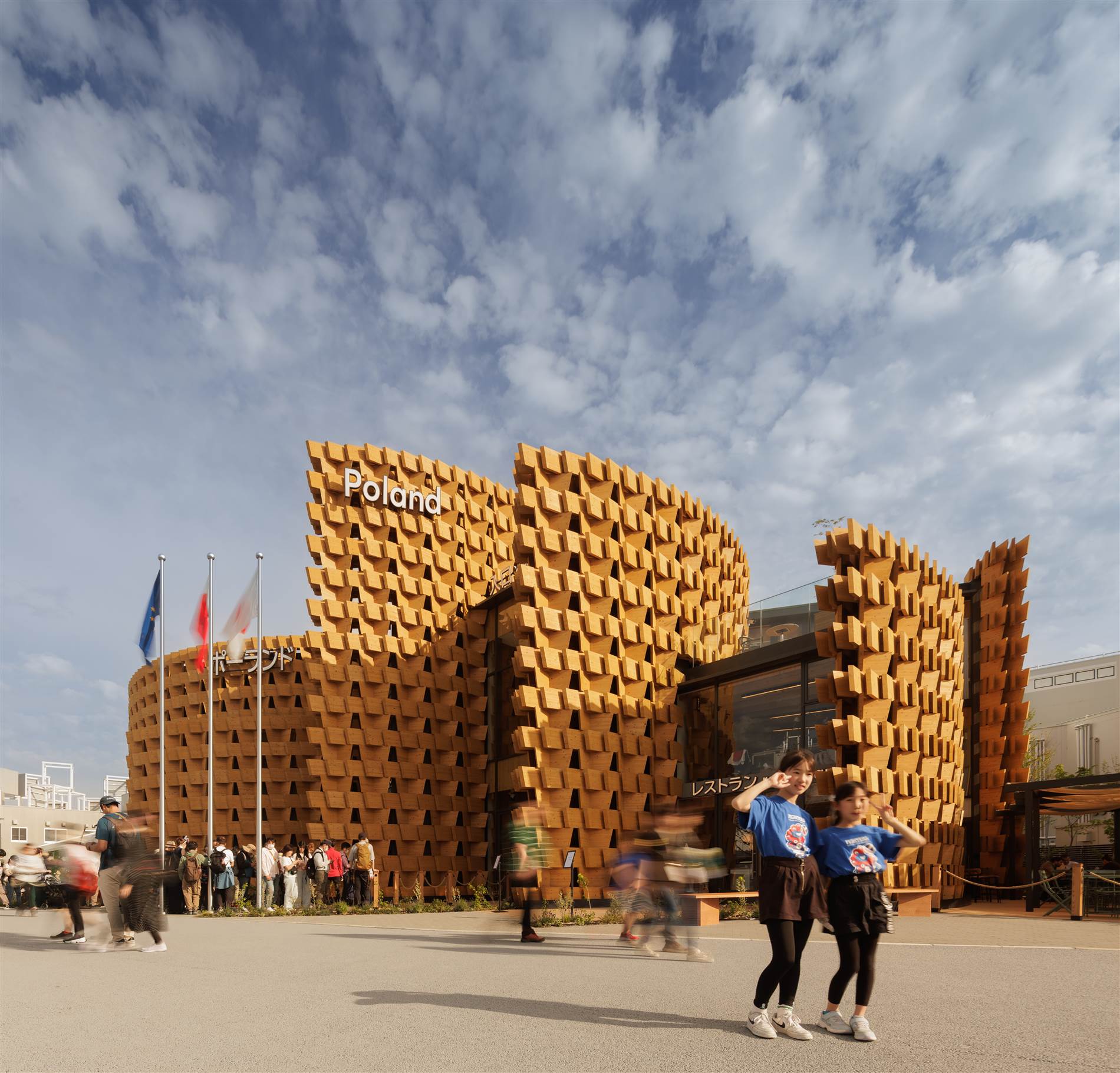 El lema con el que Polonia se presenta en esta Expo fue “Heritage that drives the future” (El patrimonio que impulsa el futuro). Interplay Architects se inspira en estas decoraciones tradicionales para dar textura a un diagrama formal que consistía en estos brazos que se abren al mundo orbitando en torno a un centro. Rápidamente, la referencia del grano de trigo los llevó a fragmentar la fachada en módulos con los que dar una escala y sobre todo, una imagen reconocible al proyecto.