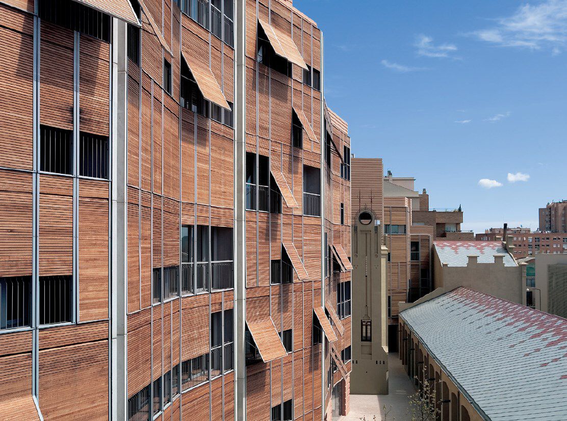Resuelve la fachada con una estructura homogénea y se nutre de los espacios interiores: los patios comunes interiores y las circulaciones enriquecen la calidad de la vivienda.