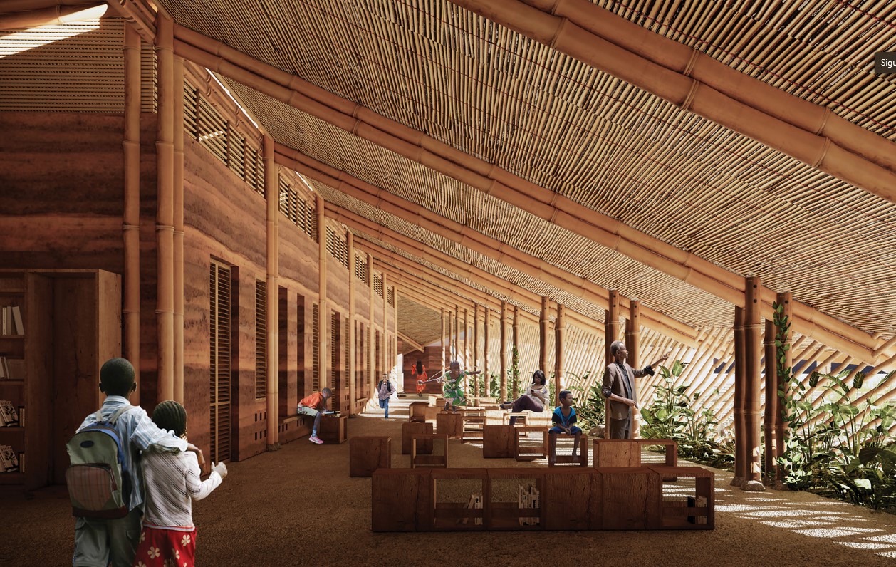 Las vigas y celosías son de madera de bambú, material que junto con la laterita ofrece un interior reconocible para los niños.