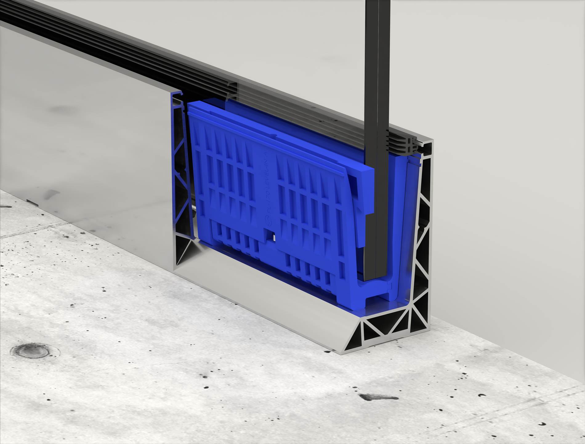 El perfil de suelo GlassFit SV-1802 SIDE es de montaje lateral, evita la pérdida de superficie, admite recrecidos no portantes de hasta 20mm y ofrece una excelente resistencia a la acción del viento.