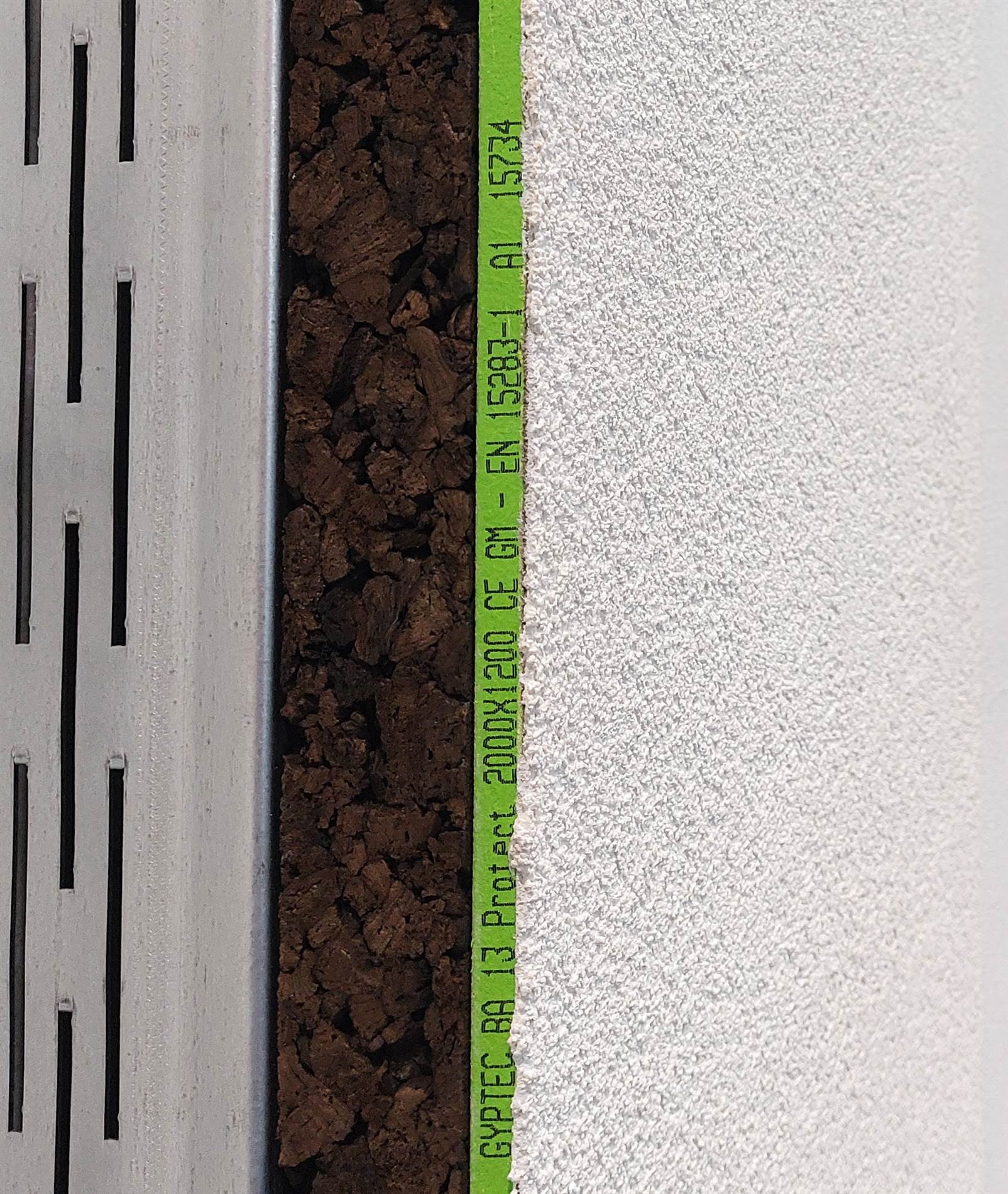La placa Gypcork, formado por la unión de una placa de yeso laminado y una plancha de aglomerado de corcho expandido (ICB) que hace la función de aislamiento térmico y acústico, ha evolucionado con la incorporación de un revestimiento de malla de fibra de vidrio que le confiere una gran resistencia a la humedad y una clasificación A1 de reacción a fuego, conformando la placa Placa GYPCORK Protect.