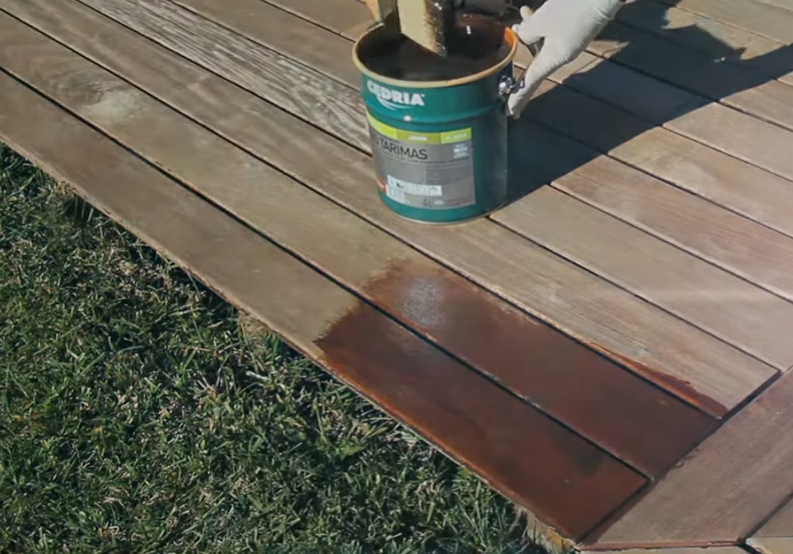El tratamiento protector se ha basado en un sistema de lasures de alta penetración formulados con tecnología nanotecnológica, específicamente diseñados para tarimas exteriores de madera tropical.