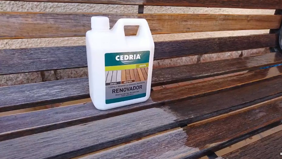 El material utilizado para la ejecución de este proceso recuperador fue el producto CEDRIA RENOVADOR, un poderoso limpiador especialmente formulado para devolver el esplendor a maderas manchadas o agrisadas por el efecto de los agentes atmosféricos, rayos UV, lluvia, polución y suciedad en general.