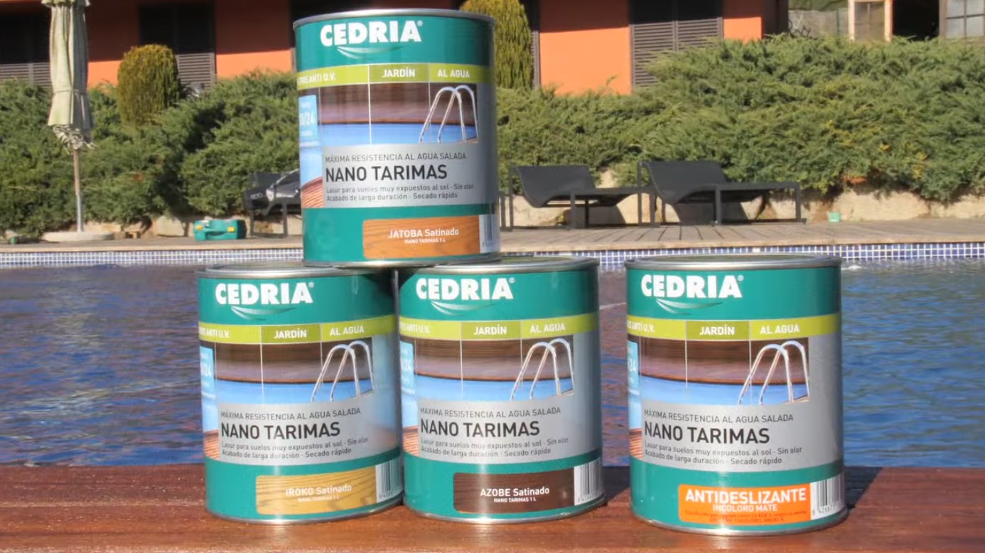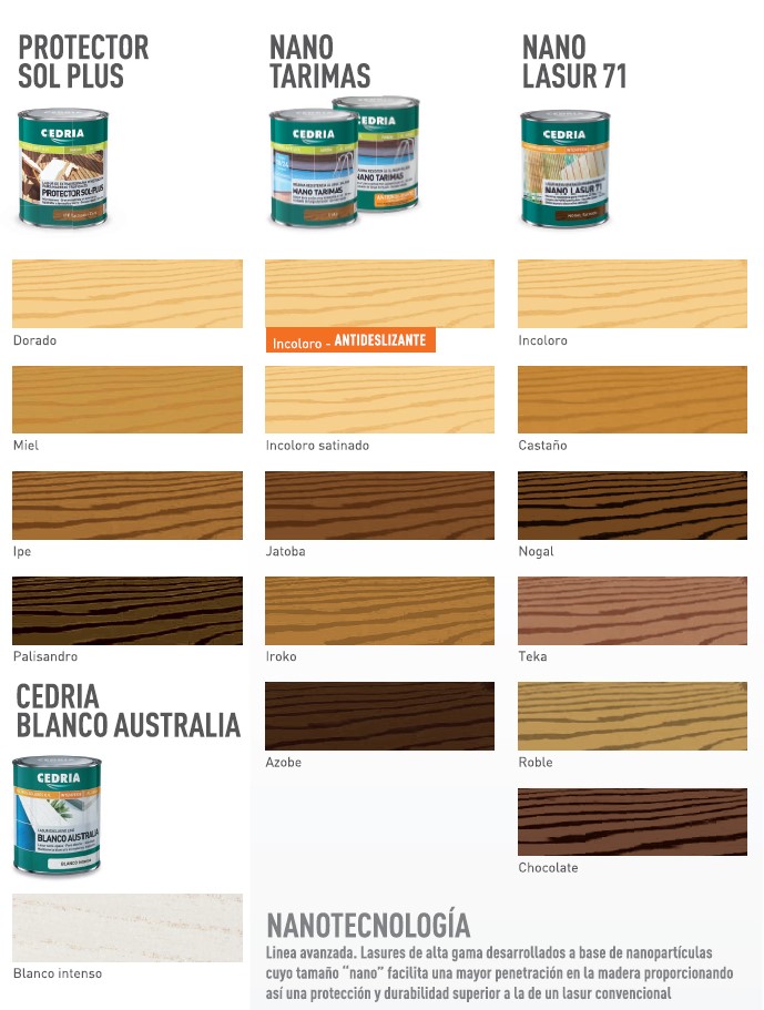 CEDRIA NANO TARIMAS es un lasur con color para tarimas cuyos pigmentos de óxido de hierro aportan una elevada estabilidad frente a la radiación ultravioleta, actuando como barrera protectora que minimiza la degradación de la lignina y el consiguiente agrisamiento de la madera.