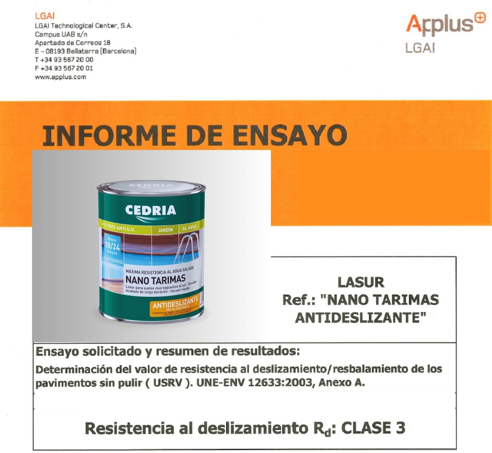 El sistema antideslizante aplicado ha sido ensayado por laboratorios acreditados, obteniendo una clasificación Clase 3 conforme a la norma UNE ENV 12633:2003, correspondiente al máximo nivel de resistencia al deslizamiento.