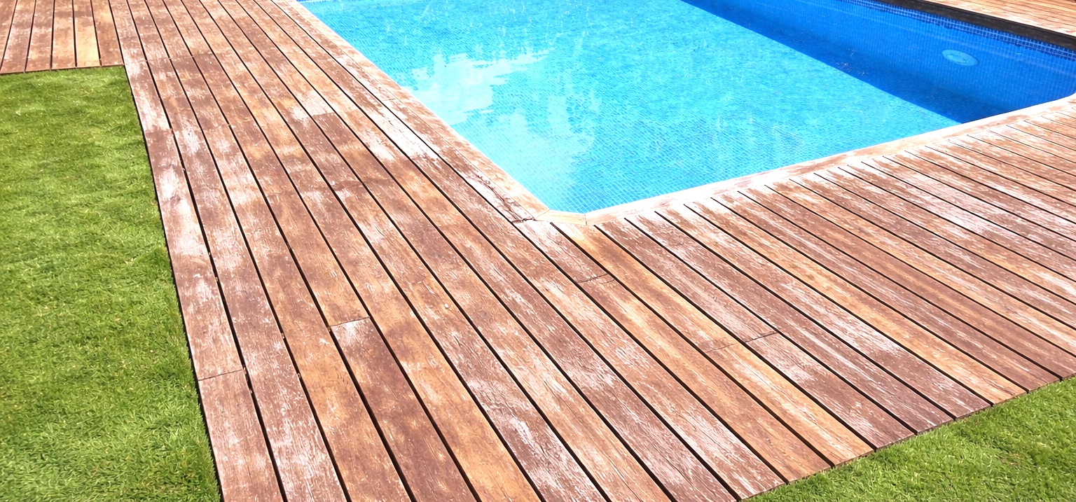 Recuperación y protección de tarima exterior de madera tropical en zona ajardinada y piscina de hotel