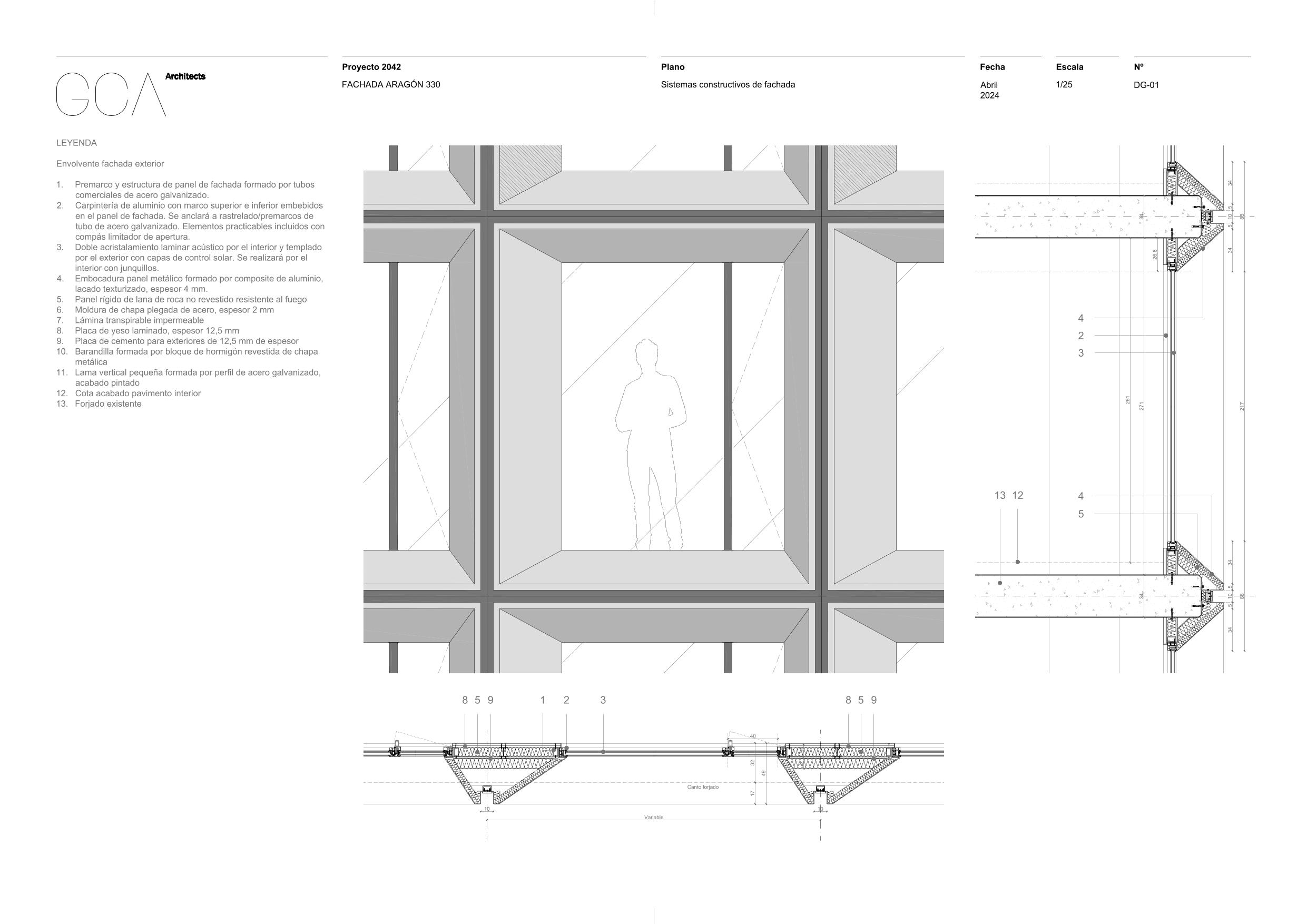 La coronación, consiste en un sistema de lamas verticales que generan una doble piel, aportando mayor privacidad y control solar. El zócalo comparte el mismo lenguaje arquitectónico, heredando así la composición de los edificios clásicos del Eixample.”