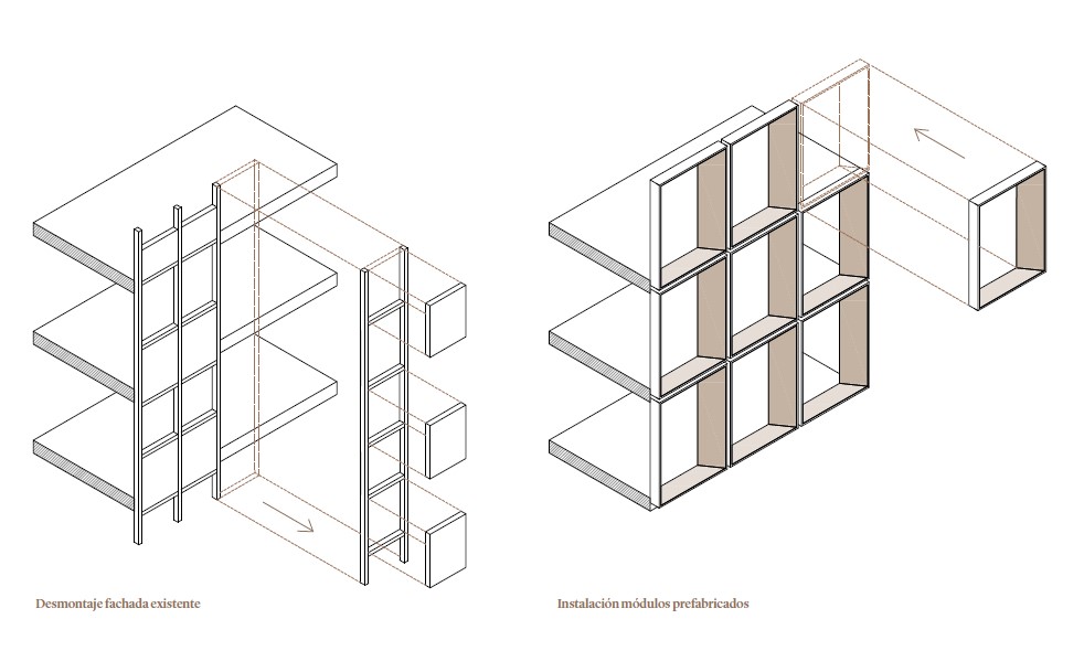 “La antigua retícula estructural de fachada, típica de la época, se reinterpreta mediante un sistema modular que amplía los huecos y mejora la iluminación natural. El objetivo es claro: crear una nueva identidad visual sin borrar la lógica original. Tanto desde una visual exterior como interior, mejorando las condiciones de confort y bienestar de los usuarios.