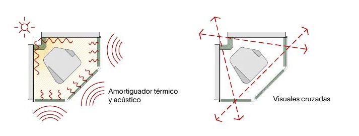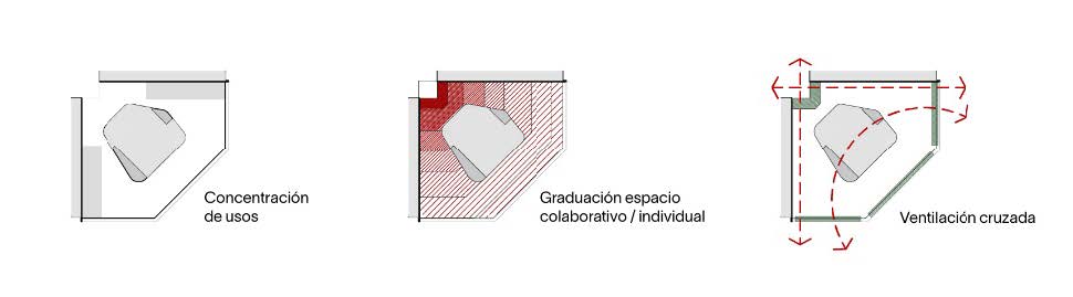 Se trabaja el hueco como un sistema ligero modular que reinterpreta la antigua retícula, creando una fachada ventilada terminada en composite, que actúa como un colchón térmico y acústico, optimizando la eficiencia general del conjunto. La incorporación de elementos practicables en fachada y la distribución que libera los elementos en esquina, permiten crear una ventilación cruzada natural.
