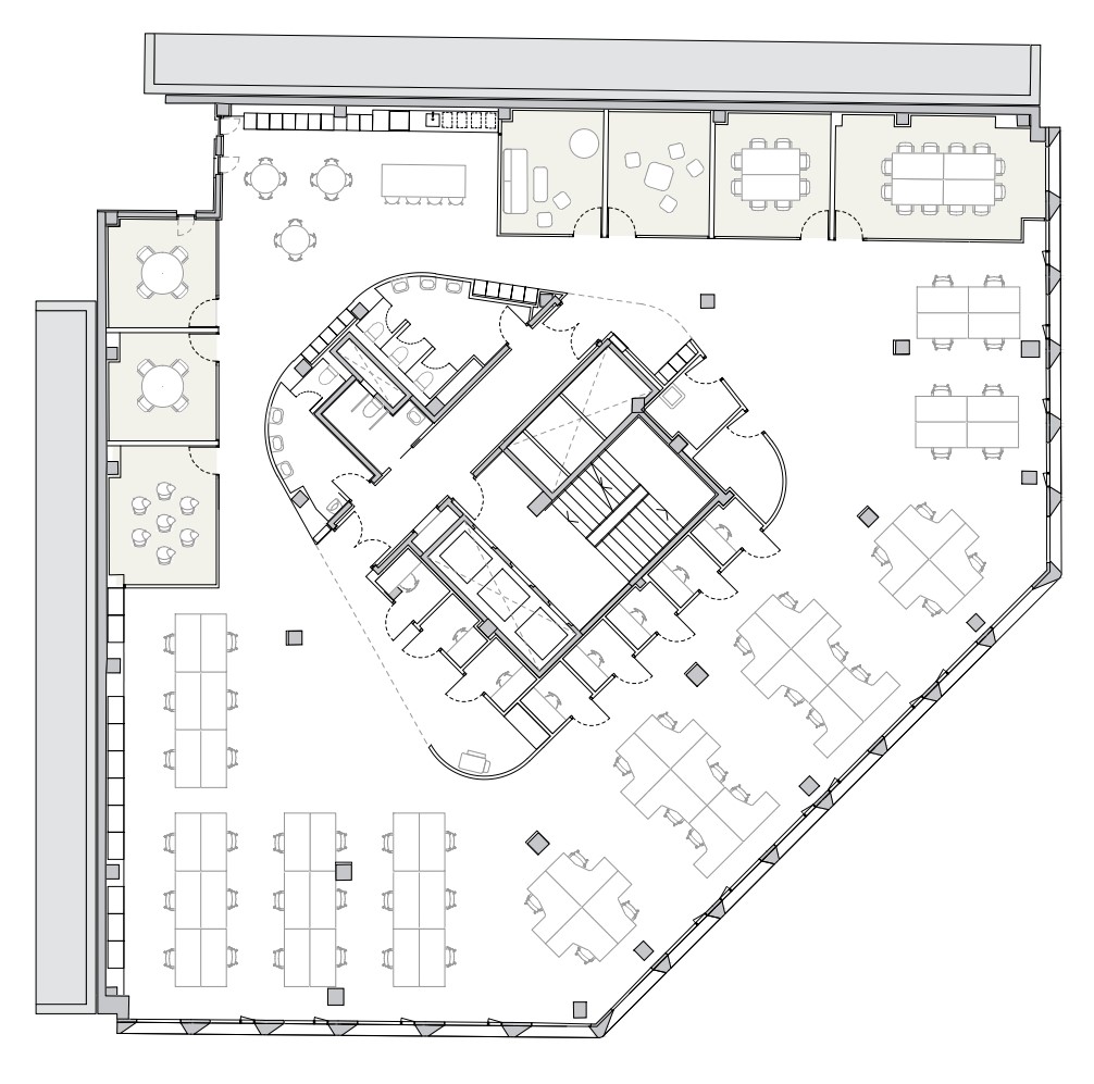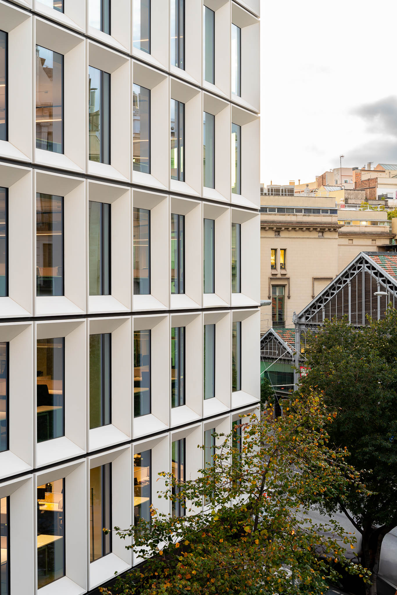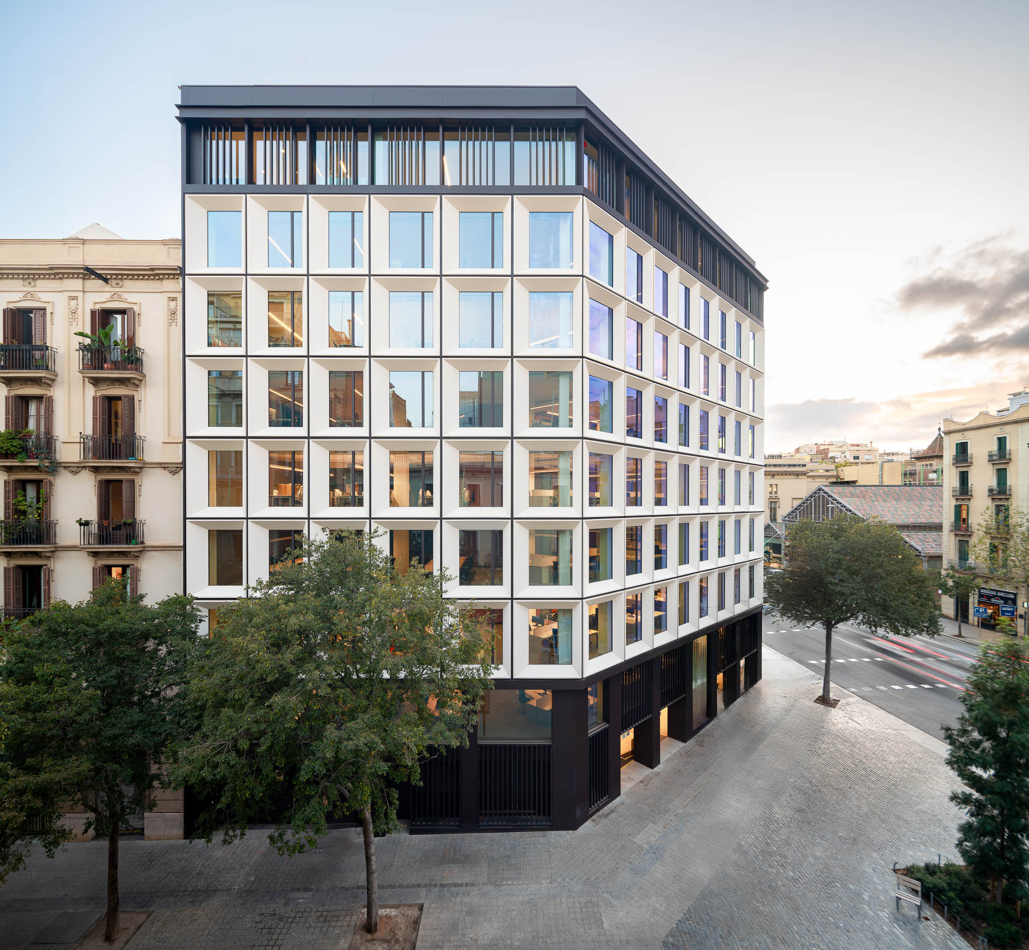 El diseño interior, a cargo de Elastiko Architects y Forgas Arquitectes, transformó la estructura original al eliminar una escalera posterior para crear un núcleo central compacto. Esta modificación permitió definir nuevos espacios de oficinas, flexibles y colaborativos, que responden a nuevas formas de trabajar con especial atención en el bienestar de los usuarios. También ha permitido la creación de una nueva fachada orientada al patio interior de manzana, favoreciendo la entrada de luz natural desde el sur y la ventilación cruzada, en la que, de nuevo, se utilizaron sistemas de máxima calidad técnica y de sensibilidad sostenible de Wicona.