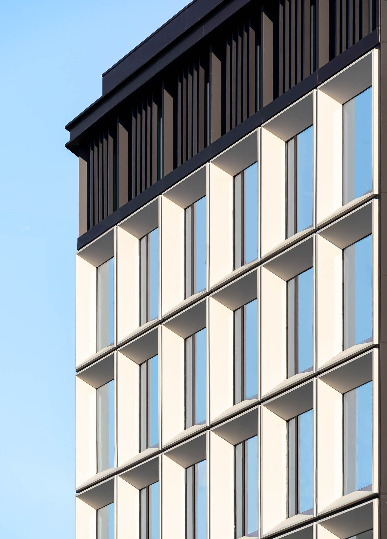 El principal desafío fue la transformación de la fachada preexistente, una retícula de elementos estructurales verticales y horizontales que soportaba un acristalamiento de vidrio azulado opaco, muy característica de la época. GCA Architects optó por una solución de alta tecnología para generar una nueva identidad sin renunciar al máximo confort.
