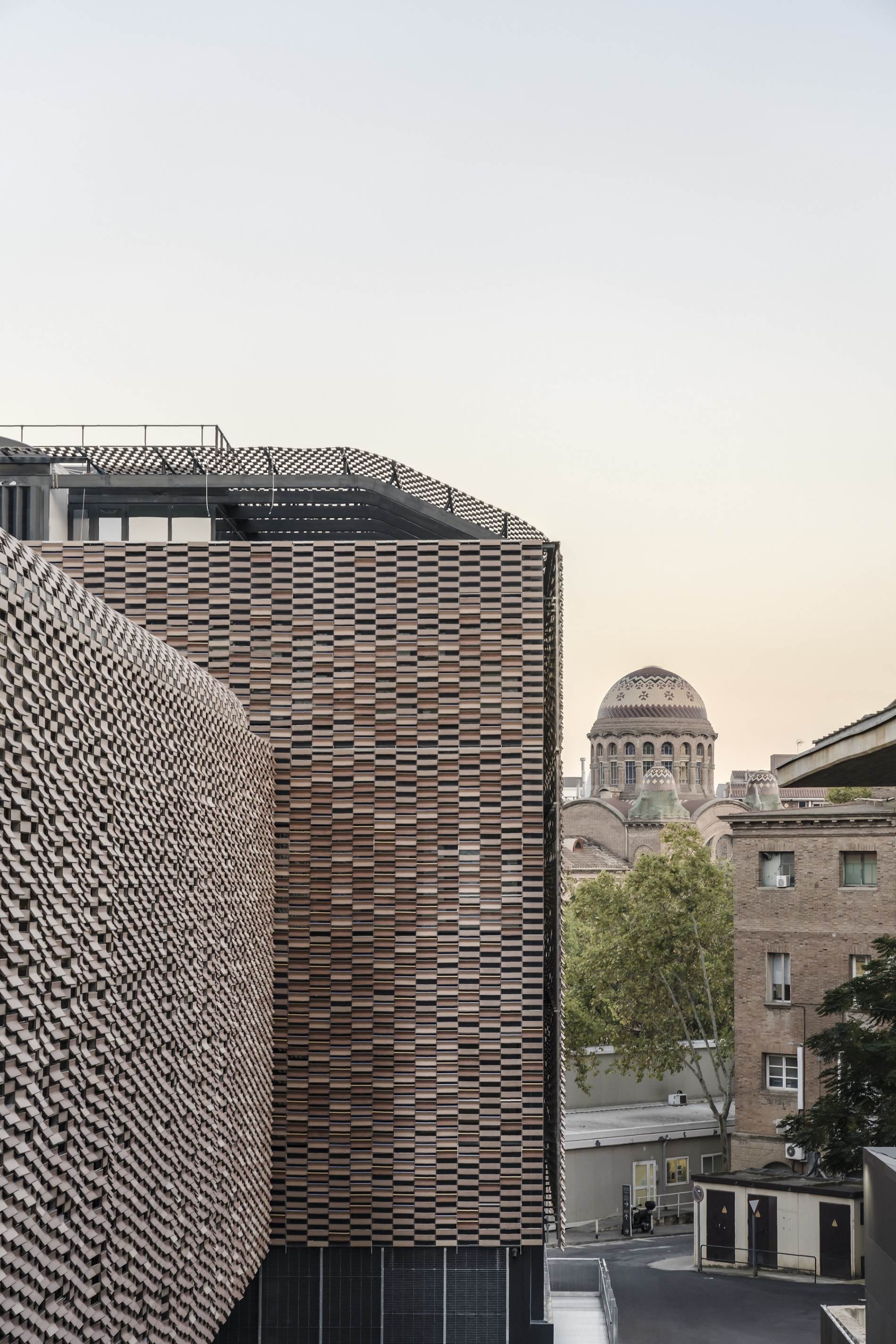 La pieza empleada pertenece al sistema Faveker desarrollado por Gres Aragón, una cerámica porcelánica que cuenta con hasta un 46% de reciclados en su composición, con absorción de agua por debajo del 0,5%, que consigue un ahorro en la demanda primaria del edifico de hasta el 40%.