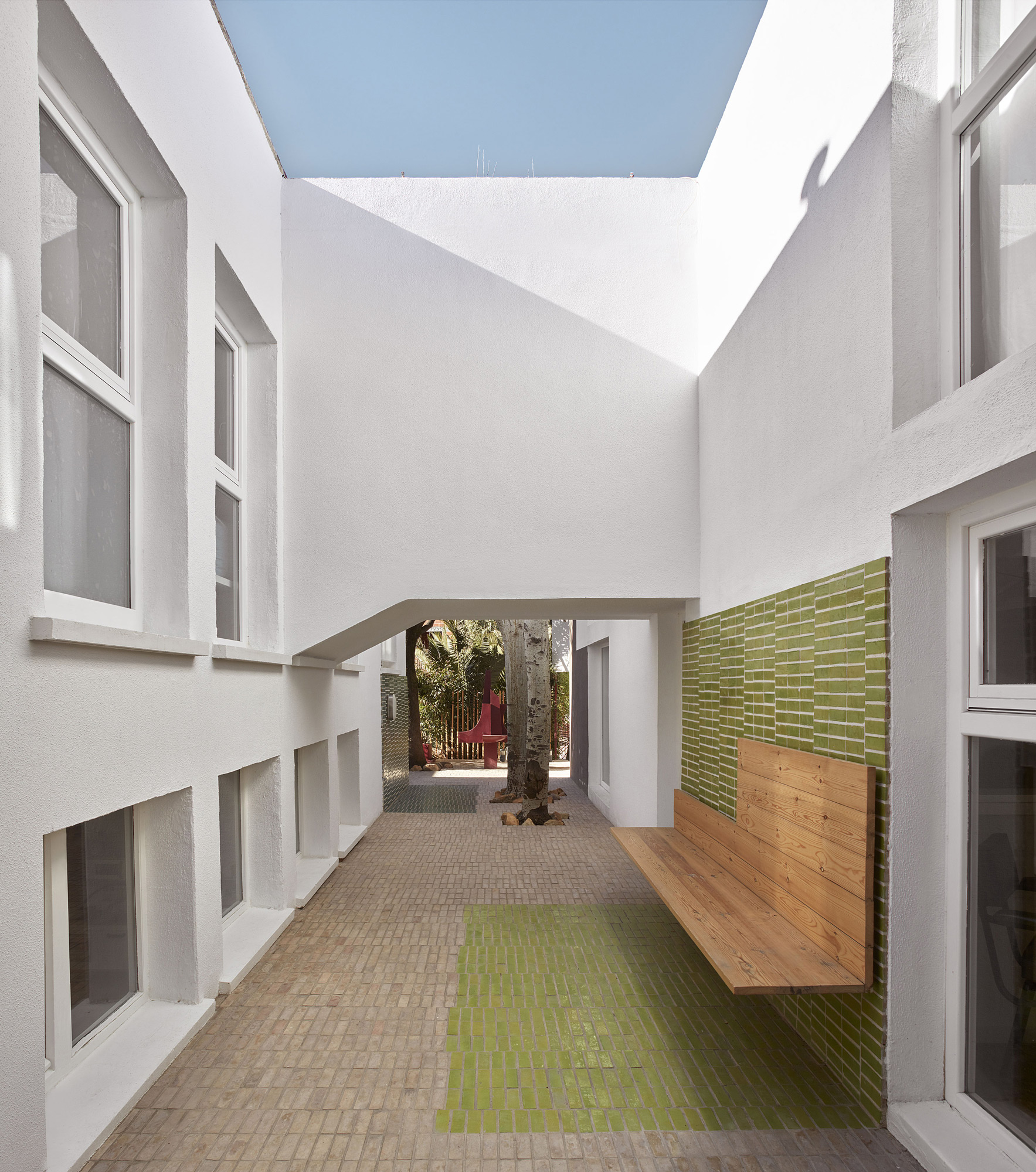 El recurso de une envolvente de madera protectora también se ha utilizado en la reforma de una guardería de Villalón de Campos por Óscar Miguel Ares, en esa ocasión materializada con tableros OSB.