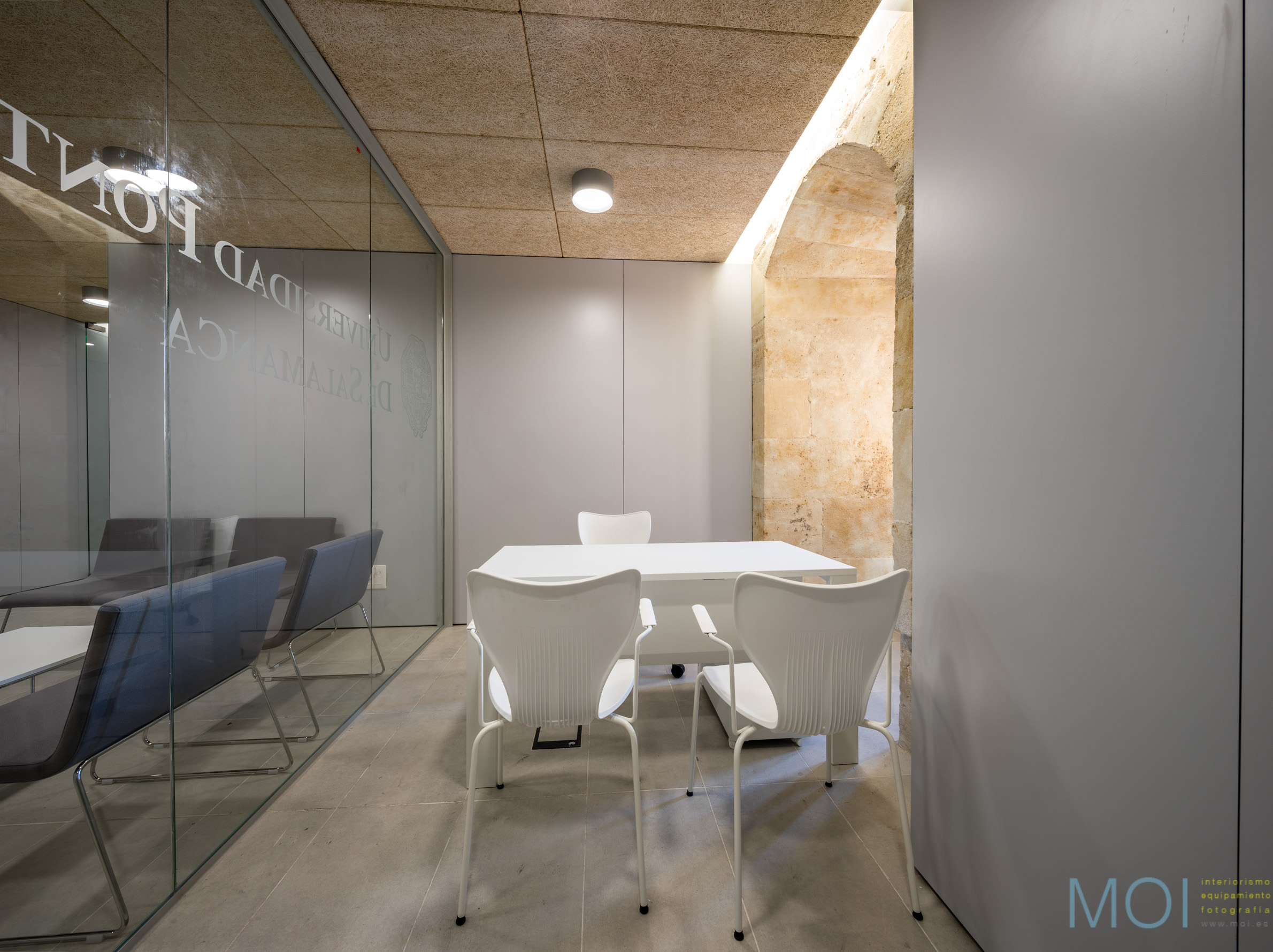 El interior de las oficinas, revestidas de acero y cristal, están consideradas a modo de arquitecturas dentro de otras. Los despachos y salas de reuniones, de menor escala, se reparten por una planta de sección mayor, a modo de recinto envolvente que genera su propia atmósfera. Se disponen forjados de chapa colaborante a modo de cielo, así como soles de led y luz blanquecina, abarcante y englobadora del muro cortina dispuesto como horizonte. Recrear un mundo dentro de otro. Un control del espacio y de la luz que dotase a las instalaciones de un confortable ámbito de trabajo.
