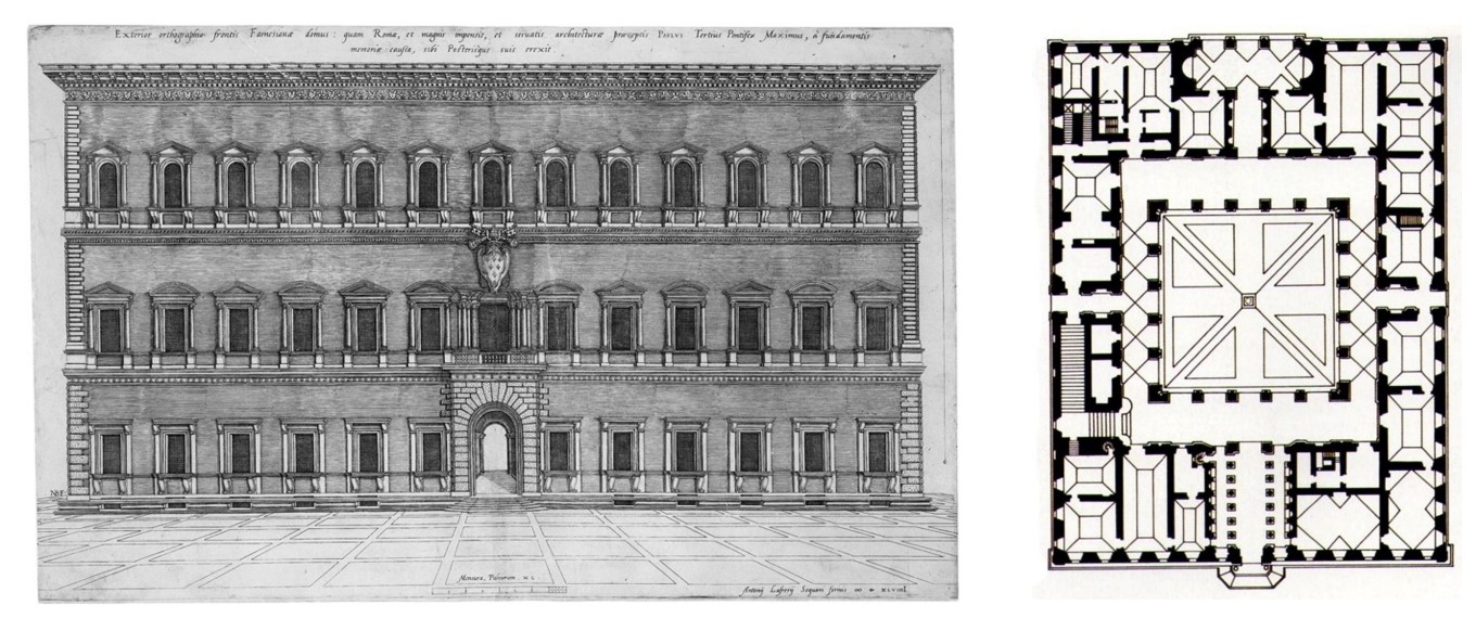 Lo más divertido de esto es que, cuando empezamos a dibujar, y planteamos el sistema con aulas en el perímetro para aprovechar la luz y que tenga la referencia solar, y un vestíbulo central que permitiera eventos, al colocarlo me di cuenta de que tenía una proporción como de palacio italiano. Fui al Palacio Farnese y vi que era exactamente de la misma dimensión, me refiero al Palacio Farnese que conocemos ahora. Sólo que el Palacio Farnese tiene un patio que va vertical, de arriba a abajo, y el nuestro, se va desplazando también, pero diagonalmente de abajo hacia arriba.