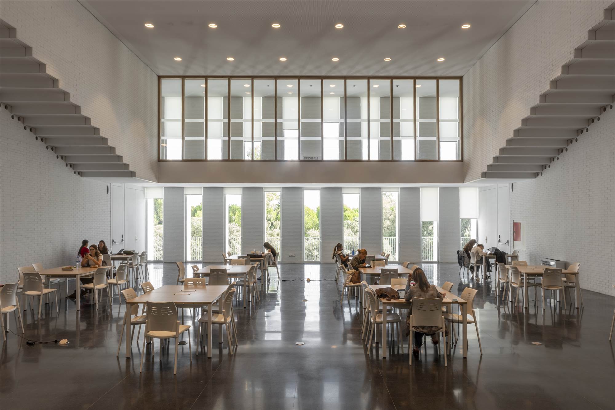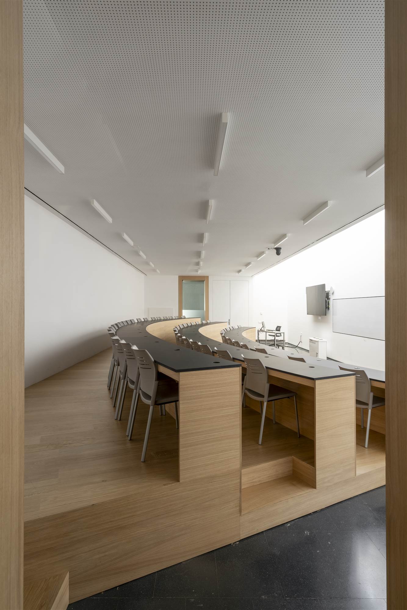 ET: Es un aulario que funciona para distintas titulaciones, incluso titulaciones que se entremezclan entre ellas. Las universidades privadas tienen una buena gestión del espacio. El aulario sirve a diferentes carreras, aunque está fundamentalmente ligado a las de leyes, y la biblioteca sí es de toda la universidad, como el restaurante, al que va a comer gente de otras facultades. Es el aulario más grande que se ha construido en la Francisco de Vitoria, y es como una máquina de dar clases con esta condición de aprovechar el espacio al 100% del tiempo.